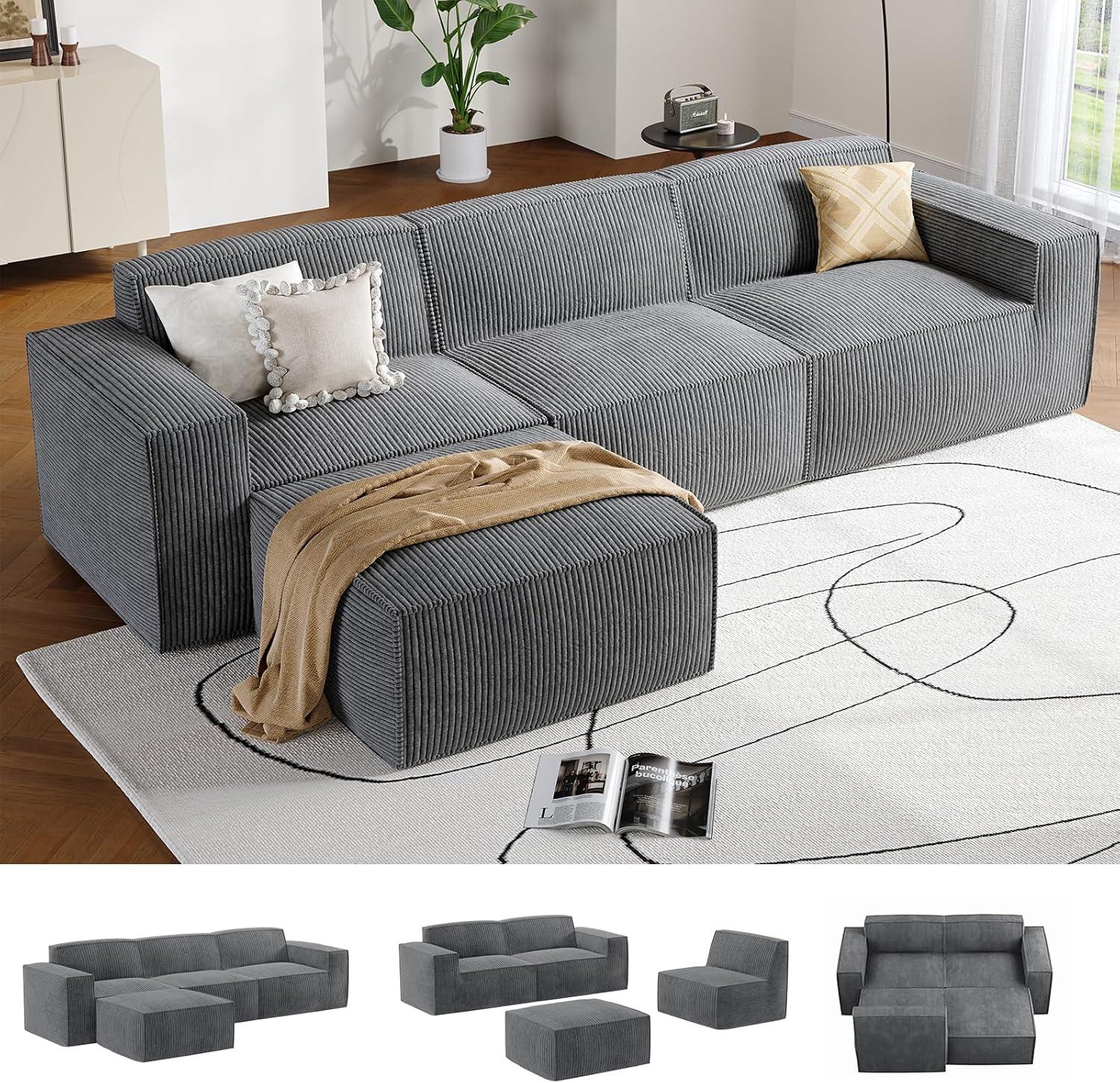 Amada 110″ Cloud Sectional Couch with L-Shape Chaise&Movable Ottoman,Modern Modular Sofa with Deep Seat, Boneless Sofa,Couches for Living Room Bedroom,No Assembly Required, Green(Corduroy Fabric)(Corduroy Gray)