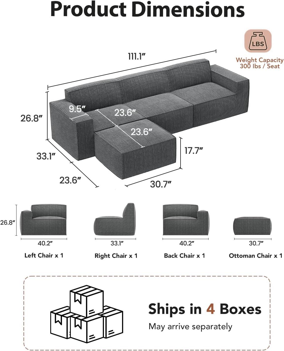 Strong Lasting Support: Experience ultimate relaxation with our high-resilience foam Boneless Couch, providing firm support and a plush. The L Shaped Couch with its 111″ length , 33″width, 26″height,47″deep seats(Chaise),and 9.5″ wide armrests, offers plenty of space to lounge and a perfect place to rest your drinks or décor. Transform any room into a cozy haven for lounging, hosting, or enjoying family movie nights.