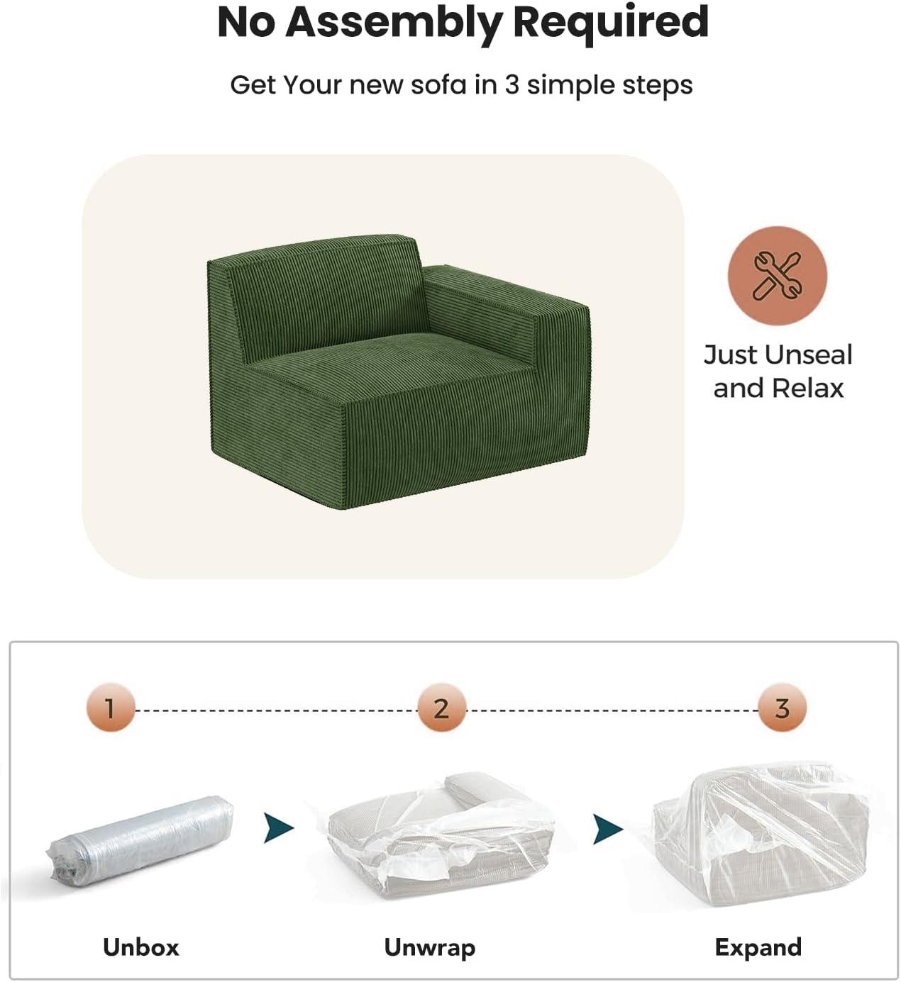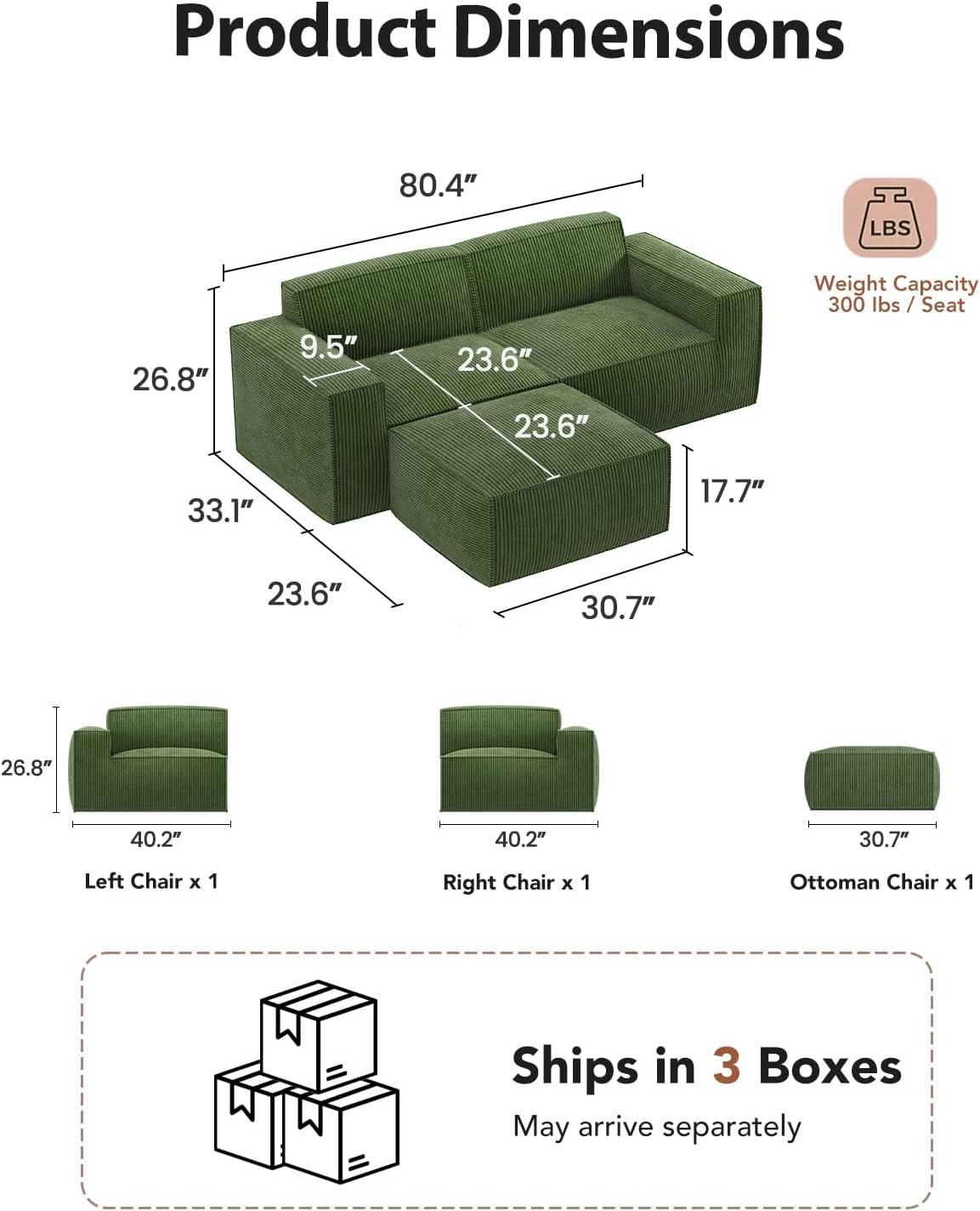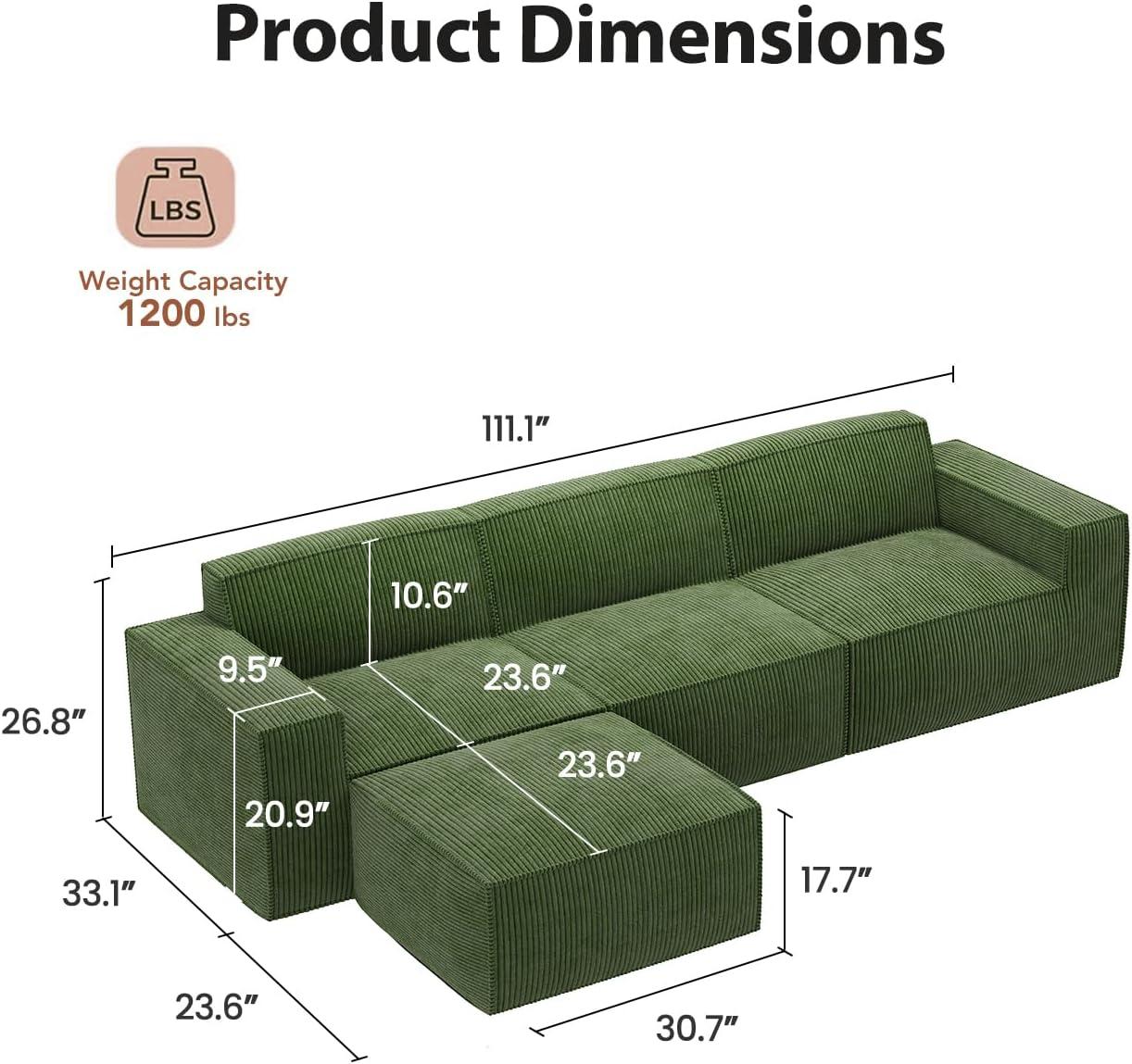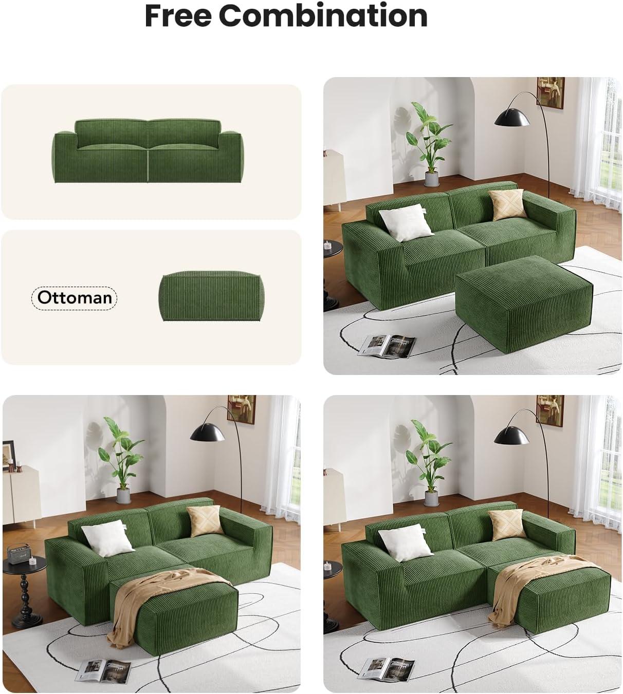 Amada 111" L Shaped Sofa Modular, Corduroy Clopud Couches with Deep Seats &High-Back, Upholstered Couches for Living Room Bedroom with Ottoman, No Assembly Required(2-Seater&1 Ottoman,Green)(Green)