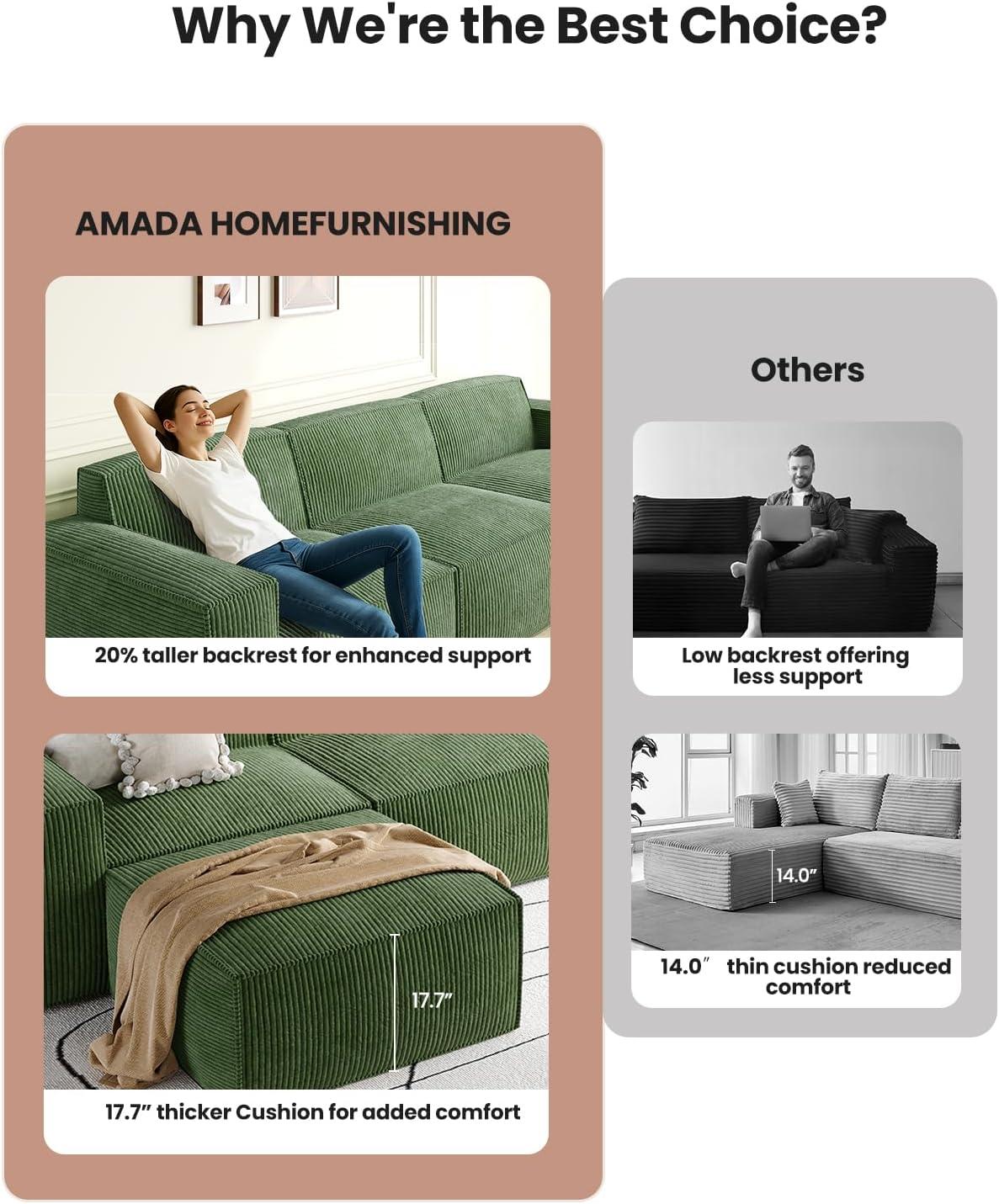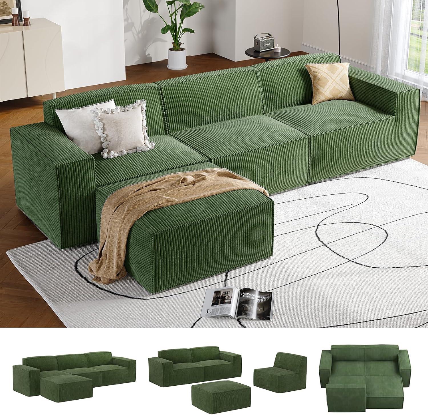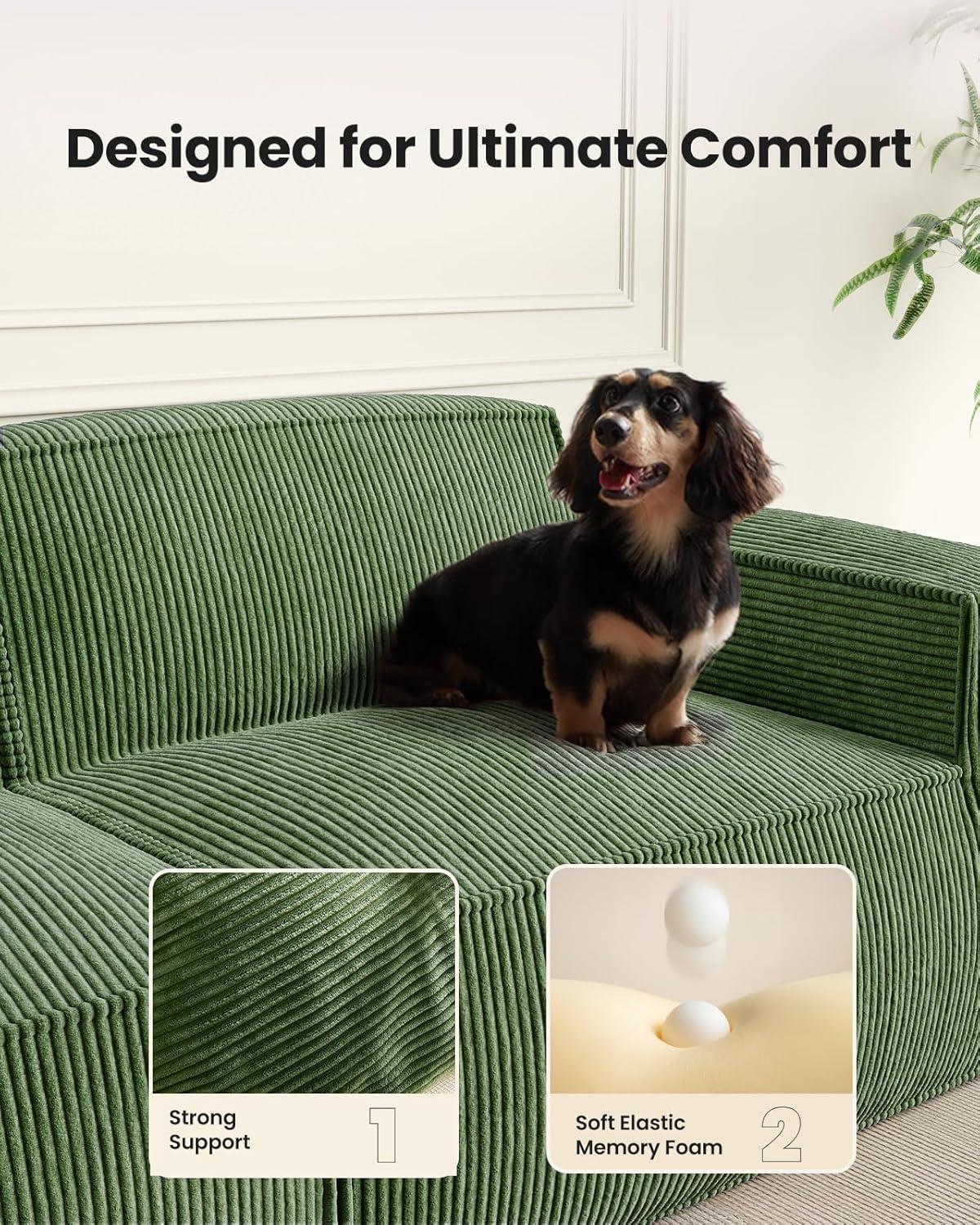 Amada 111″ L Shaped Sofa Modular, Corduroy Clopud Couches with Deep Seats &High-Back, Upholstered Couches for Living Room Bedroom with Ottoman, No Assembly Required(2-Seater&1 Ottoman,Green)(Green)