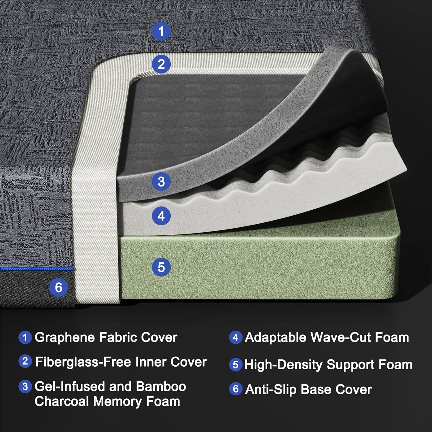 Graphene Fabric for Cool Sleep: The outer cover of this memory foam queen mattress is made of innovative graphene fabric, known for its excellent thermal conductivity. It efficiently disperses body heat across the surface of this mattress queen size 12 inch, reducing hot spots and creating a cooler, more consistent sleep environment throughout the night.