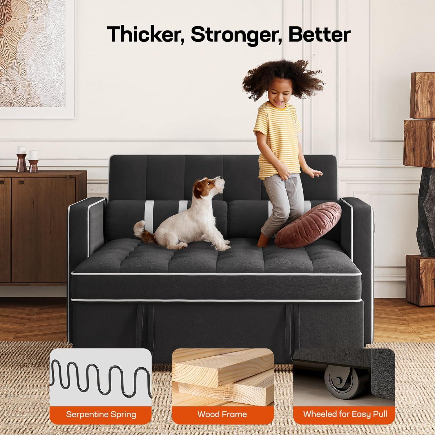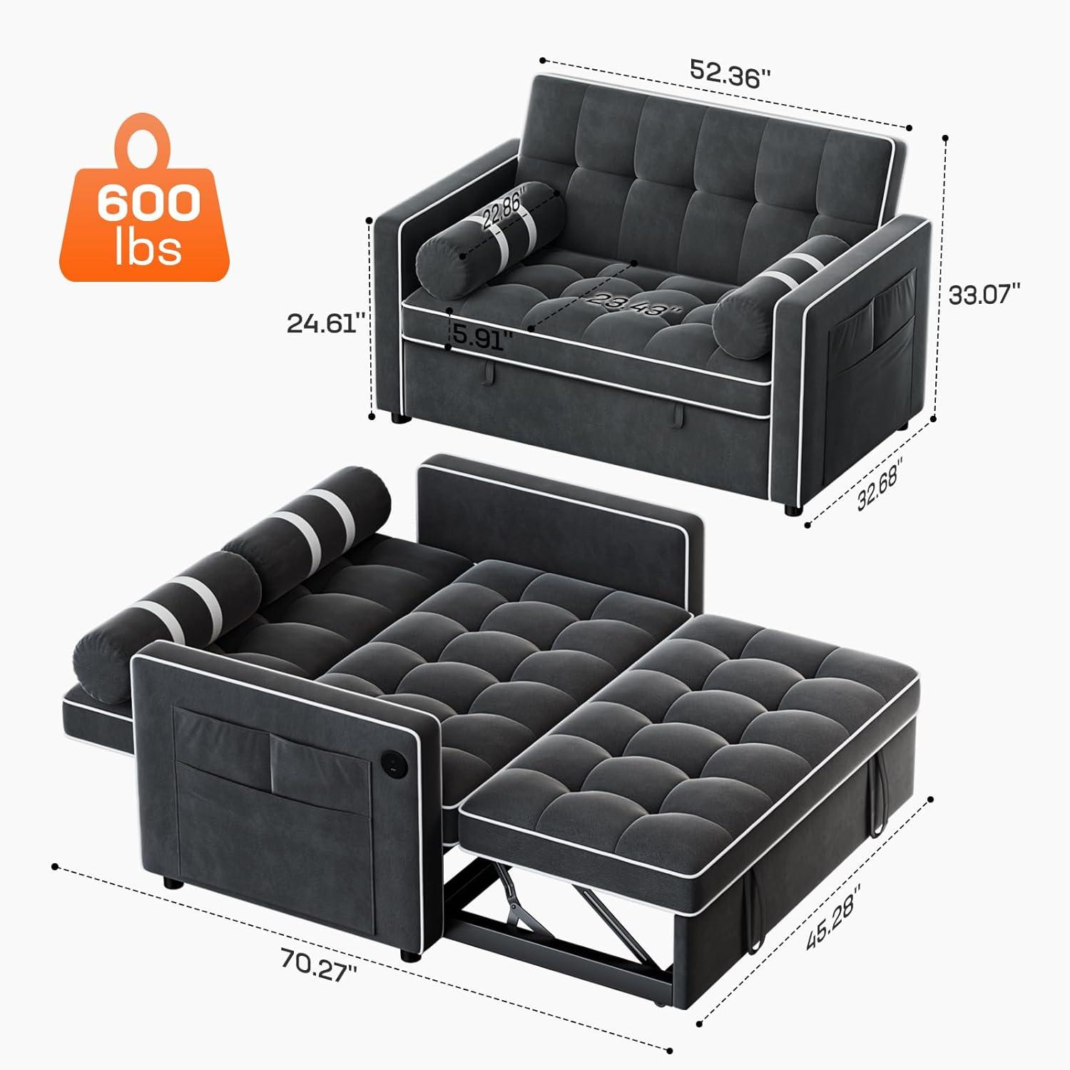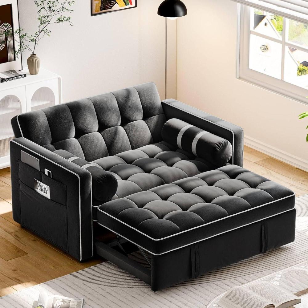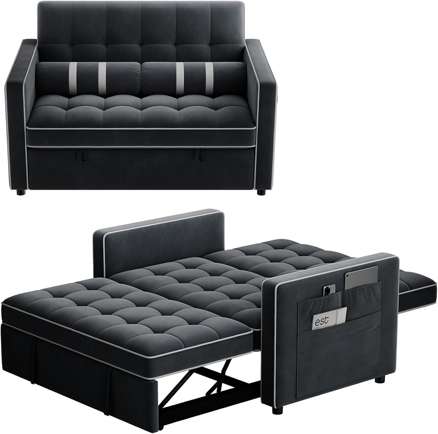 Amada 3-in-1 Convertible Sleeper Sofa Bed, Futon Couches for Living Room with USB Ports&Side Pockets, Adjustable Backrest, Velvet Fabric,Pull Out Couch, Loveseat, Grey(Black)