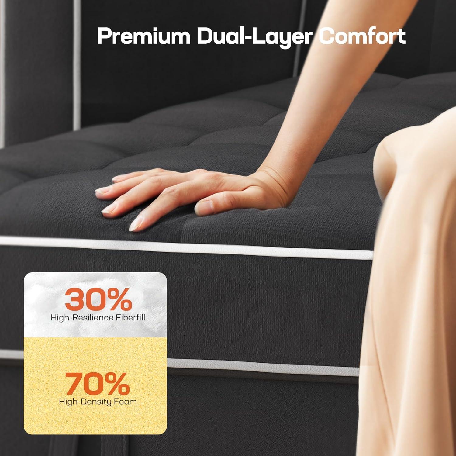 𝗕𝘂𝗶𝗹𝘁 𝗧𝗼 𝗟𝗮𝘀𝘁 𝗪𝗶𝘁𝗵 𝗔 𝗦𝘁𝘂𝗿𝗱𝘆 𝗙𝗿𝗮𝗺𝗲:Thanks to a strong steel frame, reinforced serpentine springs, and thick wood base, the pull out couch bed with usb offers a stable and secure place to rest. Enjoy the comfortable support you’ve always imagined while adding elegance to your unique living space.(Please confirm your space matches the 3 in 1 convertible sleeper sofa bed dimensions before purchasing)