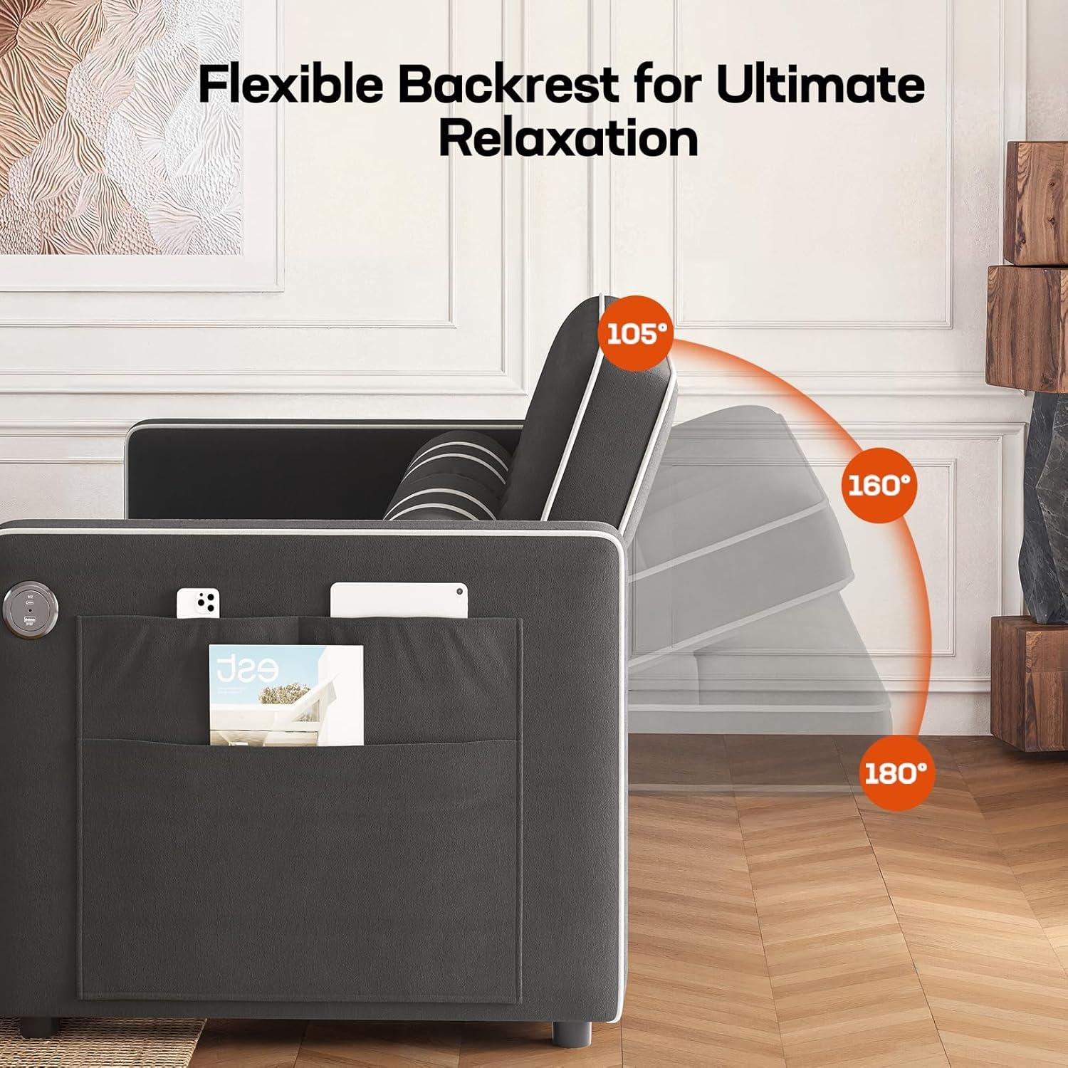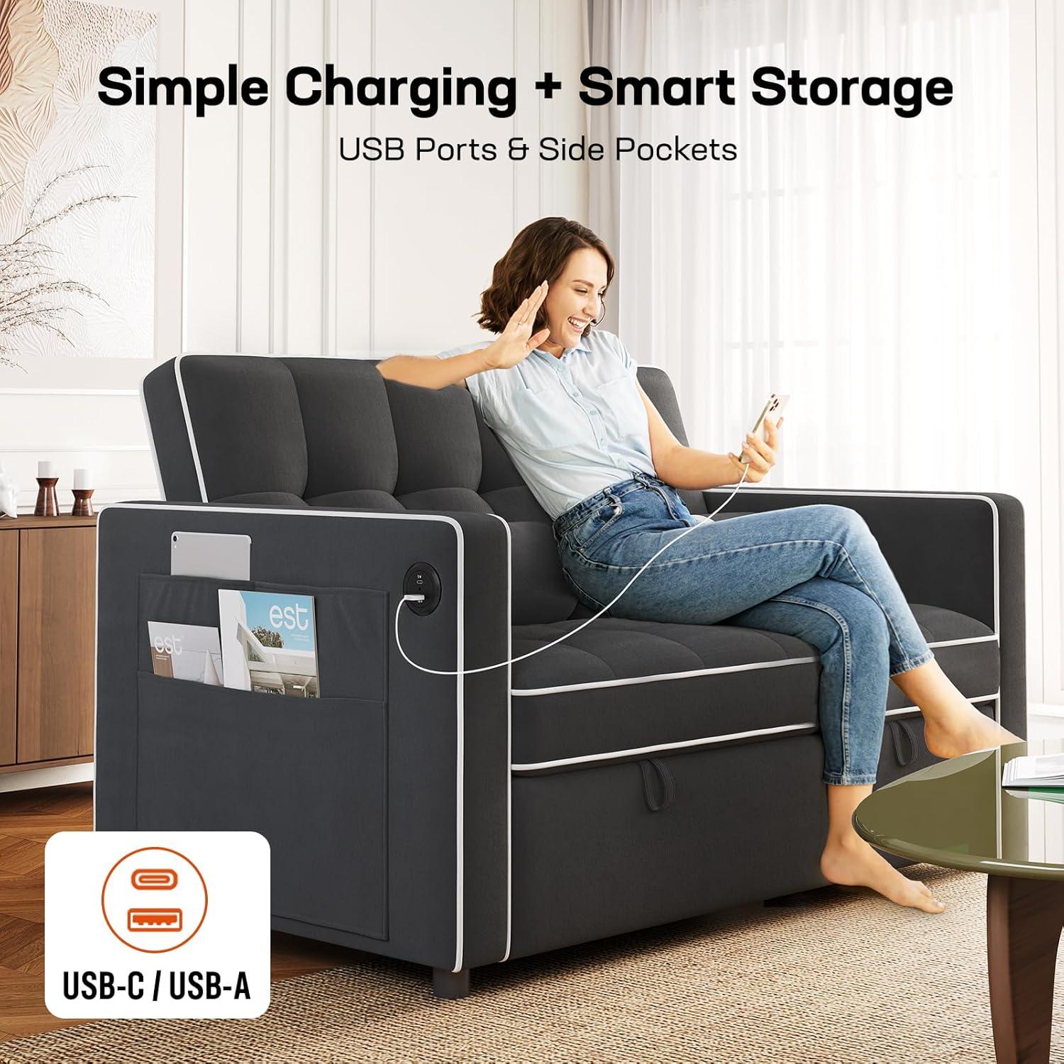 𝗣𝗿𝗮𝗰𝘁𝗶𝗰𝗮𝗹 𝗨𝘀𝗯 𝗖𝗵𝗮𝗿𝗴𝗶𝗻𝗴 & 𝗦𝘁𝗼𝗿𝗮𝗴𝗲:With built-in USB ports for convenient charging and side storage pockets, this sleeper sofa and convertible sofa bed helps to keep everything you need all in one place.Large side pockets can store your cell phone, remote control, magazines, newspapers, etc, making storage simple and easy.