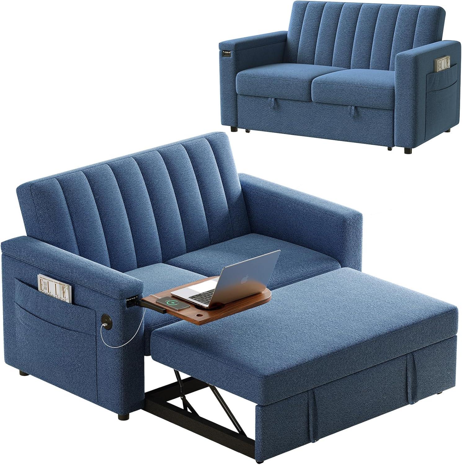 Amada 3 in 1 Sleeper Sofa Bed,Pull Out Couch with Side Table, Convertible Loveseat with Adjustable Backrest,Chaise Lounge with USB Ports & Side Pockets for Living Room, 69” Pull Out Sofa Bed(Beige)(Dark Blue)