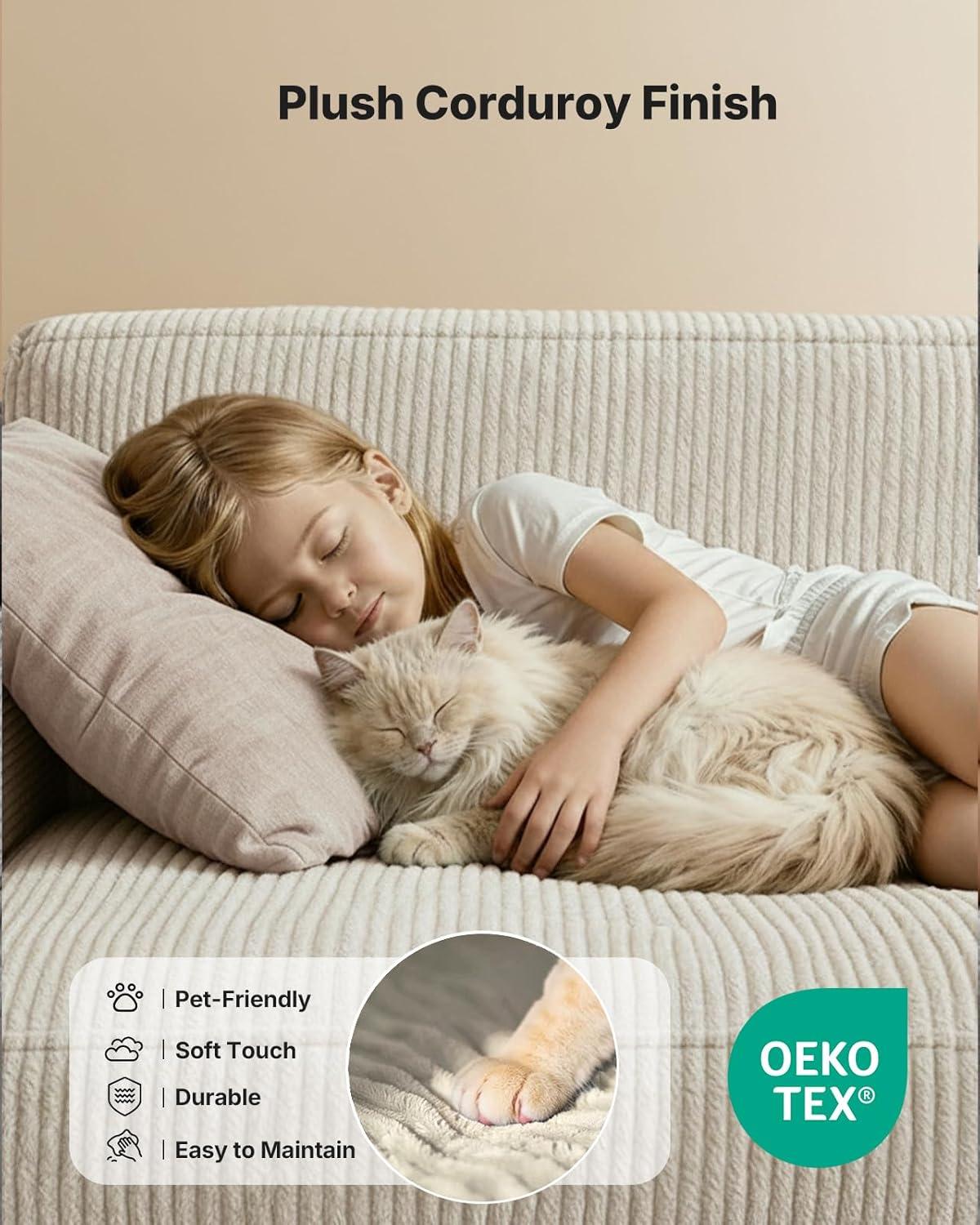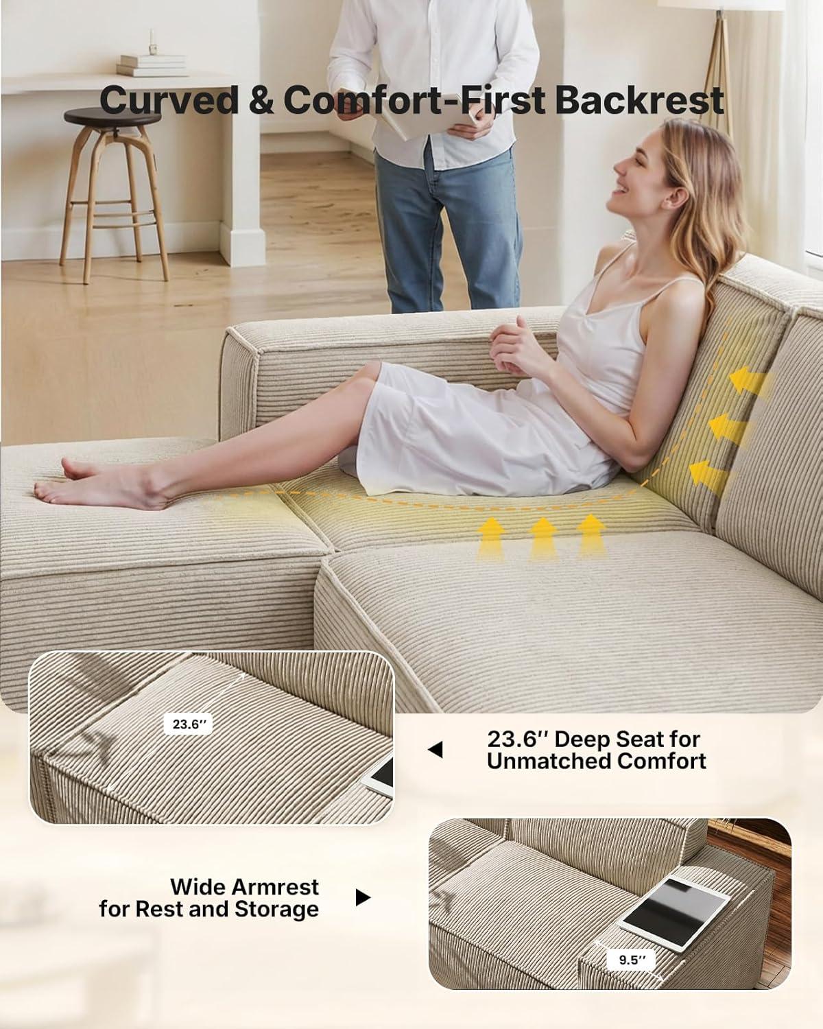 【Stronger Support & Spacious Seat】With a 20% higher backrest, our corduroy cloud couches provide enhanced support for your back and shoulders, ensuring comfort and stability. The oversized modular sofa features a deeper seat and wider arms, which enhance comfort and provide more space for your essentials. Whether you're sitting, lying, or leaning, its spacious design guarantees comfort every time.