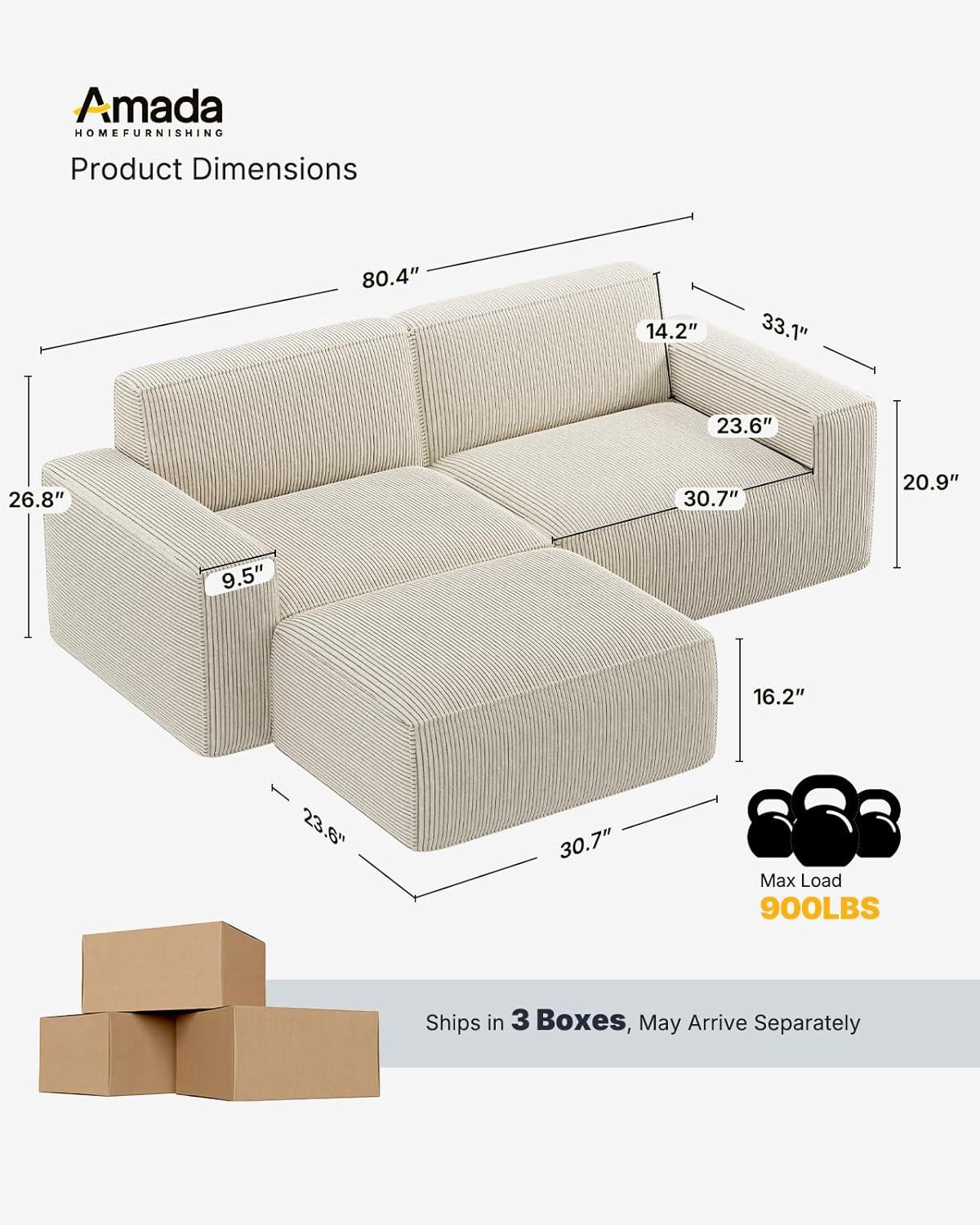 Amada 80″ L Shaped Modular Sofa, Corduroy Cloud Couch with Deep Seats & High Back, Upholstered 2-Seater Couches with Ottoman for Living Room Bedroom, No Assembly Required (Beige White)