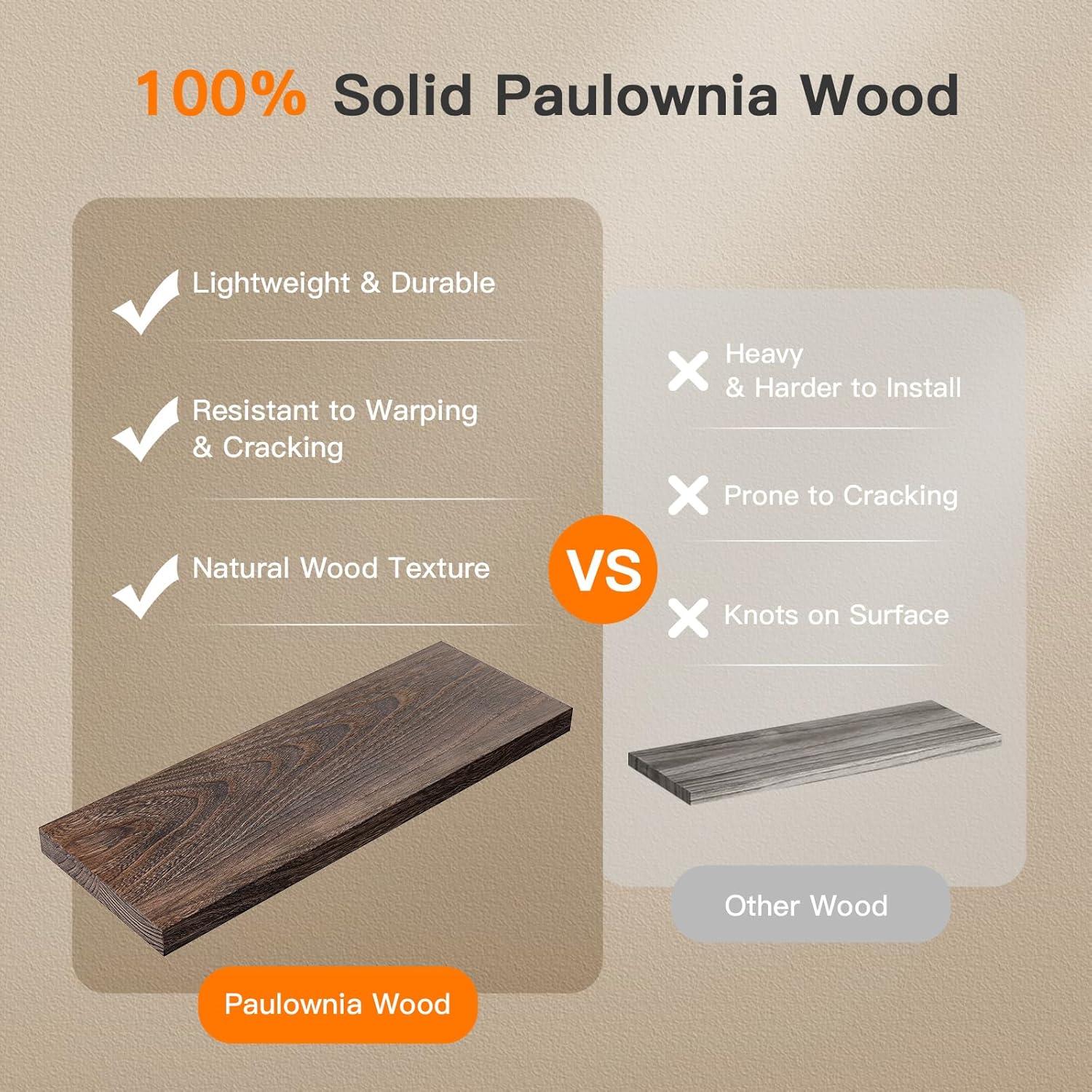 Solid Paulownia Wood: Our floating shelves are crafted from 100% paulownia wood with a fine wood grain and attractive finish. Paulownia wood is naturally resistant to decay, warping, and pests, making these bathroom shelves perfect for wall decor in any living space.