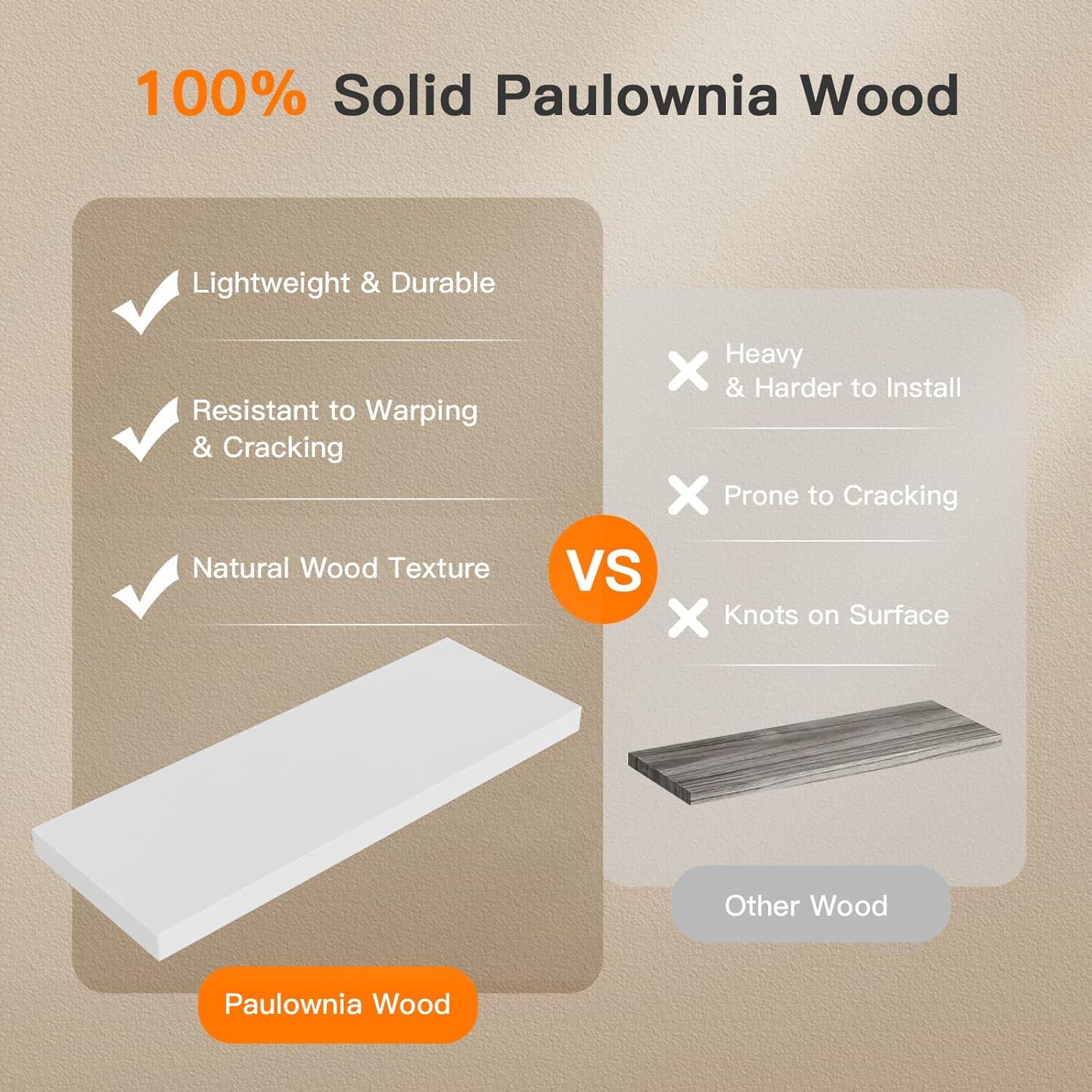 Solid Paulownia Wood: Our floating shelves are crafted from 100% paulownia wood with a fine wood grain and attractive finish. Paulownia wood is naturally resistant to decay, warping, and pests, making these bathroom shelves perfect for wall decor in any living space.