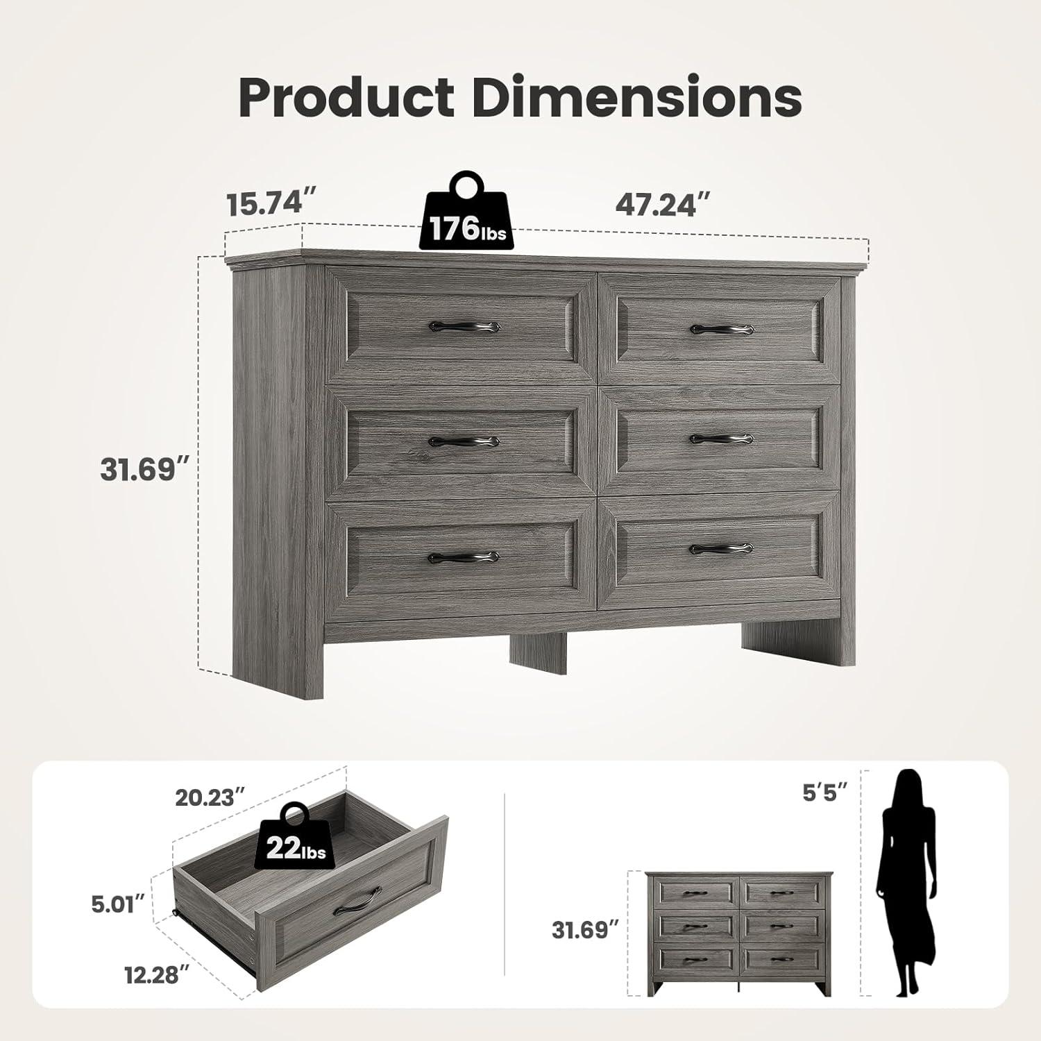Amada Farmhouse 6 Drawer Dresser for Bedroom, 47.2 Inch Wide Wood Dresser with Natural Texture, Large Drawers, Rustic Farmhouse Chest of Drawers for Bedroom, Living Room, Hallway, Gray(Grey)