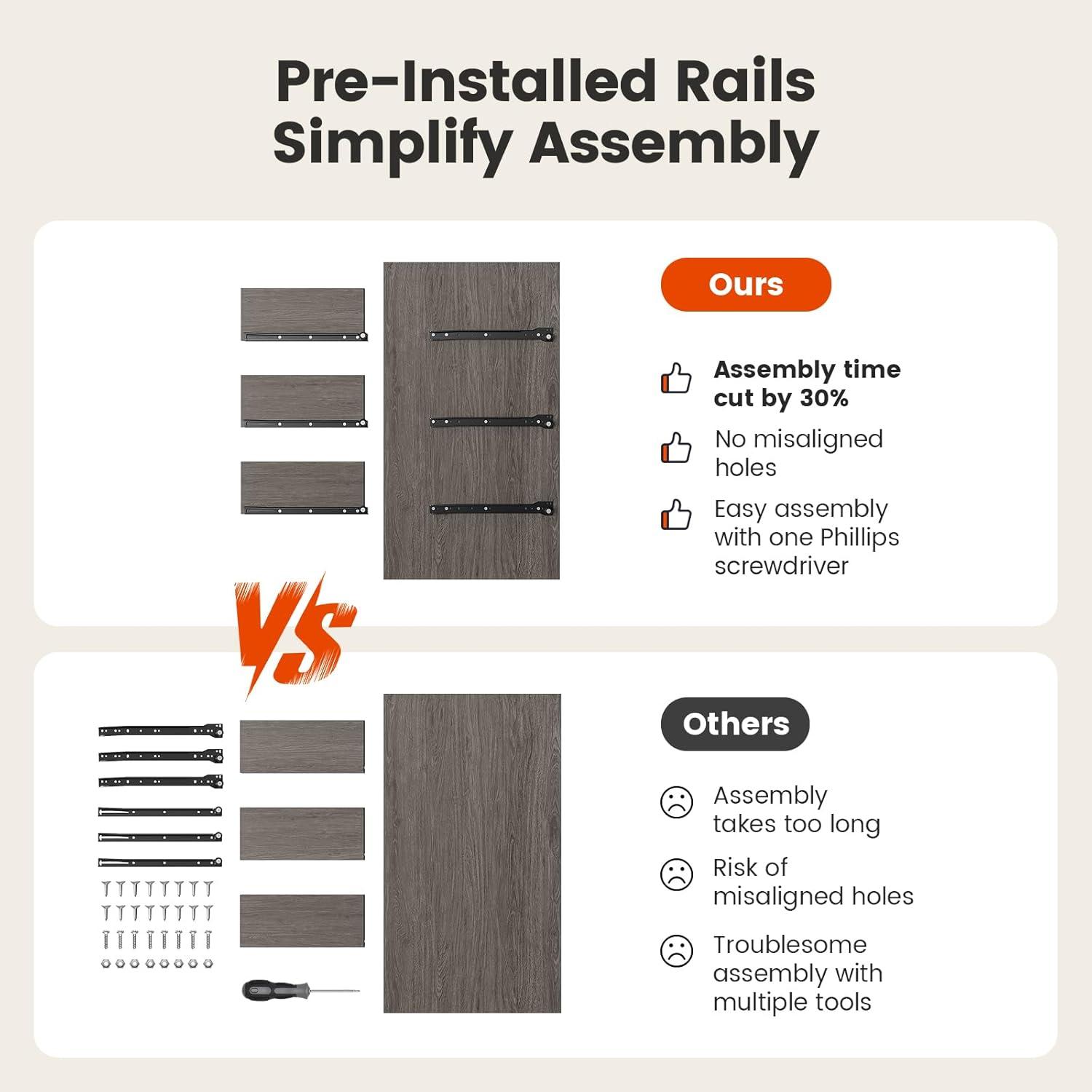 EASY SETUP, SINGLE BOX DELIVERY: Enjoy a stress-free assembly process with clearly labeled parts, easy-to-follow instructions, and a thoughtful design—including pre-installed drawer hardware to save time. Everything arrives in one compact box, making unboxing and setup quick and convenient.