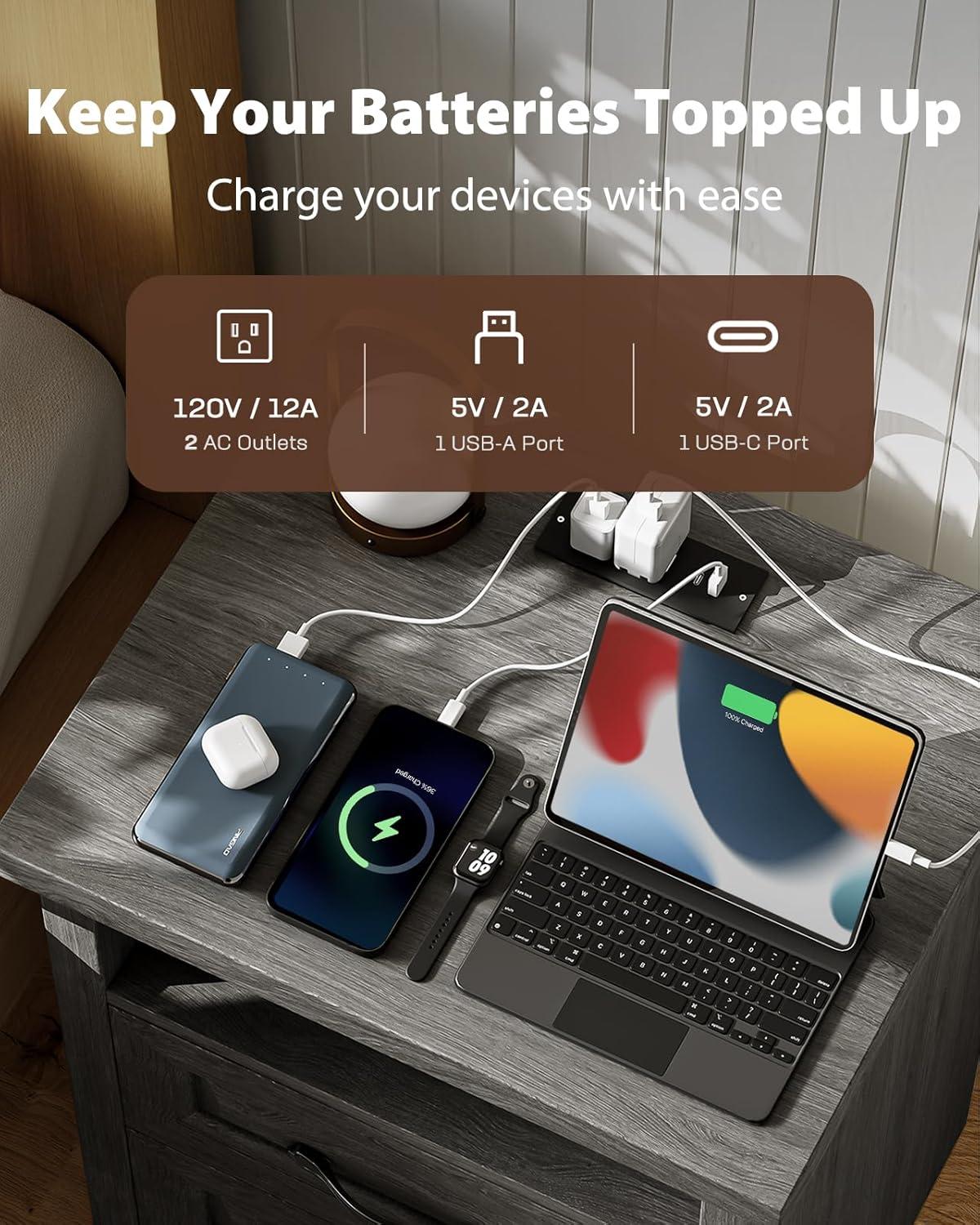 【Built-in Charging Station】More than just a nightstand — equipped with 2 AC outlets, 1 USB-A, and 1 Type-C port, this bedside table keeps your phone, tablet, and other essentials powered up. The built-in charging station is cleverly hidden in the open shelf to reduce clutter and keep your space clean and modern.