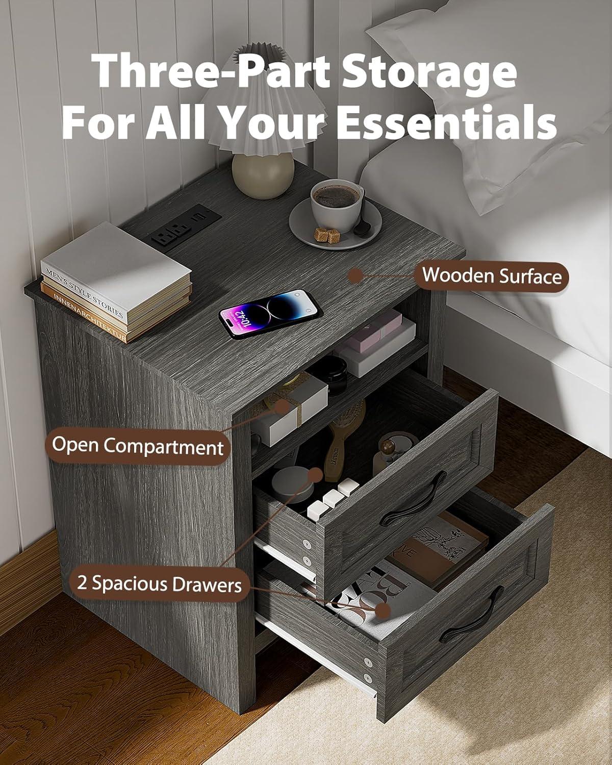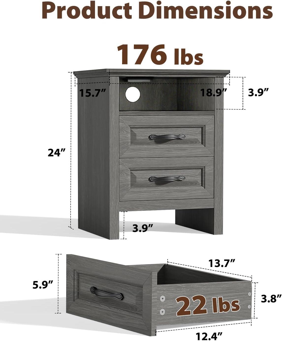 Amada Farmhouse Nightstand with Charging Station, 18.9 Inch Wide Bedside Table with 2 Drawers, USB A Port, USB C Port, 2 AC Outlets, Rustic Farmhouse End Table for Bedroom, Gray(Grey)
