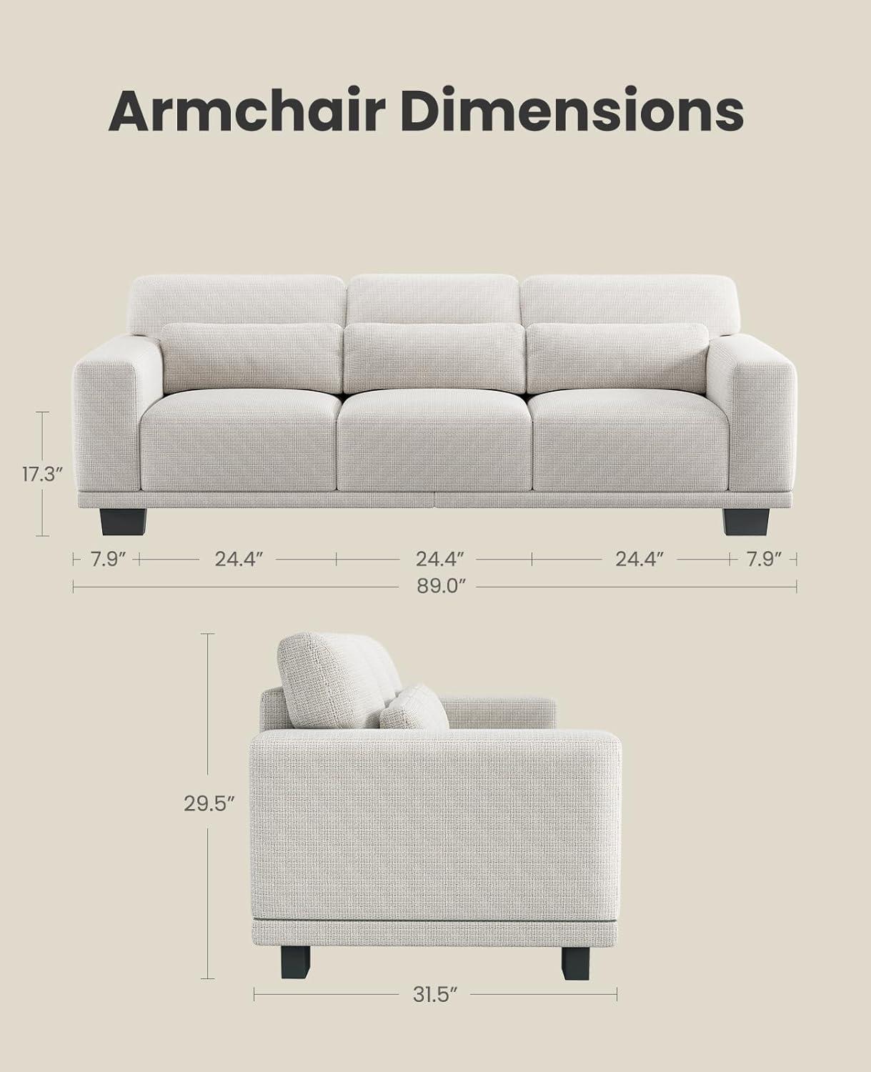 【Linen Fabric&&Independent Spring】Made with premium Linen fabric and 50% thicker foam cushioning, the Couches for living room offers a soft, comfortable feel. The indivvidually wrapped pocket coil springs provide exceptional support, so you can sit backand relax for hours without any discomfort