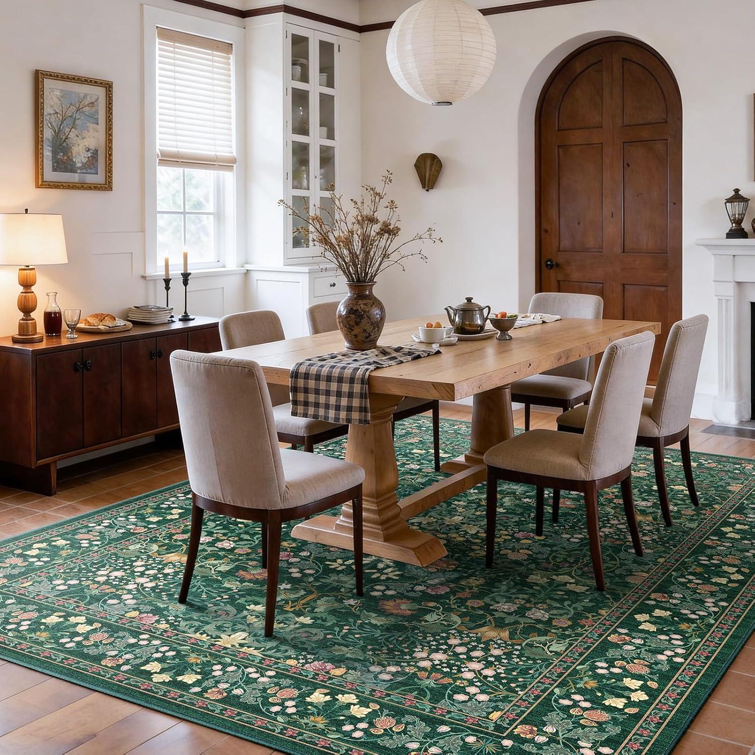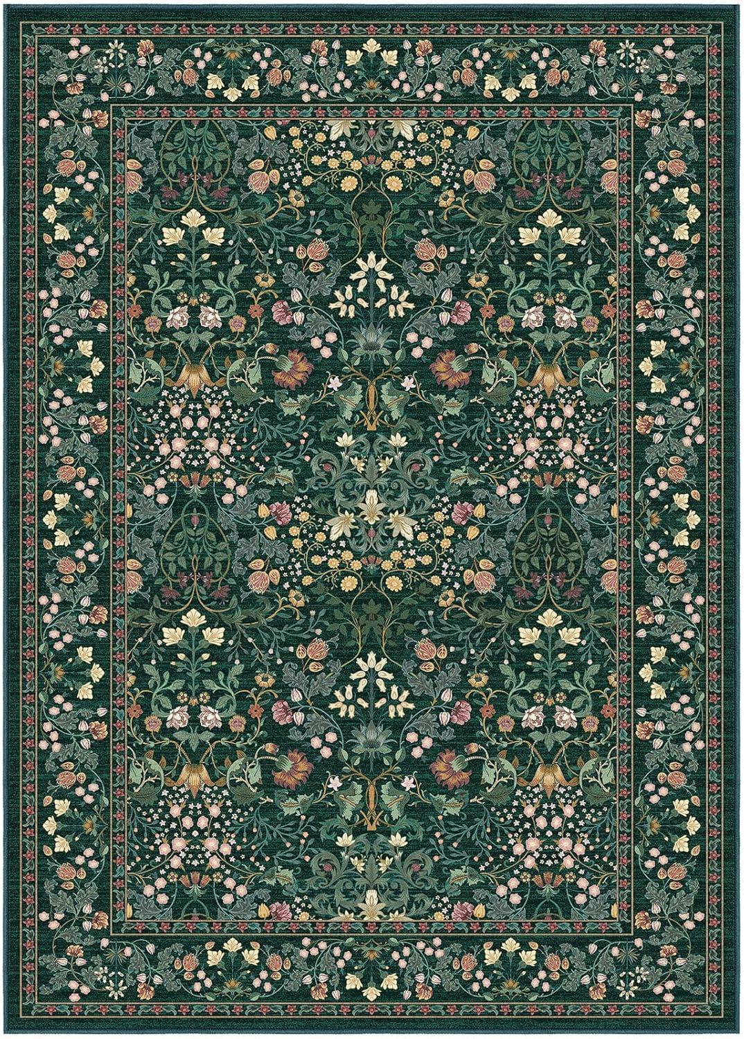 Floral Artistry Rug: Inspired by the beauty of nature, this intricate green area rug features a rich backdrop complemented by soft, harmonious tones, showcasing delicate blossoms and lush foliage. It’s the perfect piece to brighten up any space, adding elegance to both modern and traditional interiors.