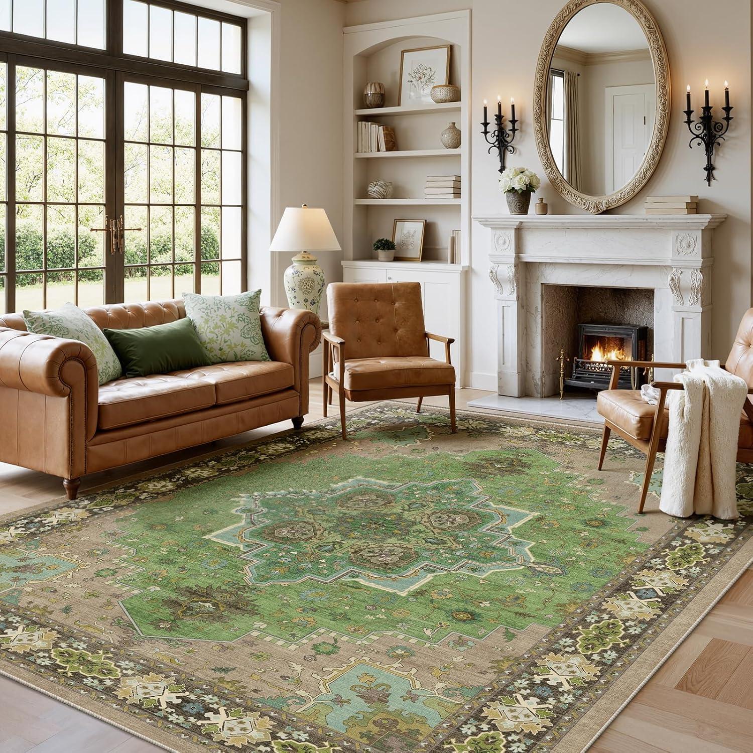 AMADA HOMEFURNISHING 9×12 Area Rug for Living Room, Vintage Washable Area Rug Low-Pile & Non-Slip Carpet for Bedroom Dining Room Nursery Home Office, Navy Blue/Brown(Green)