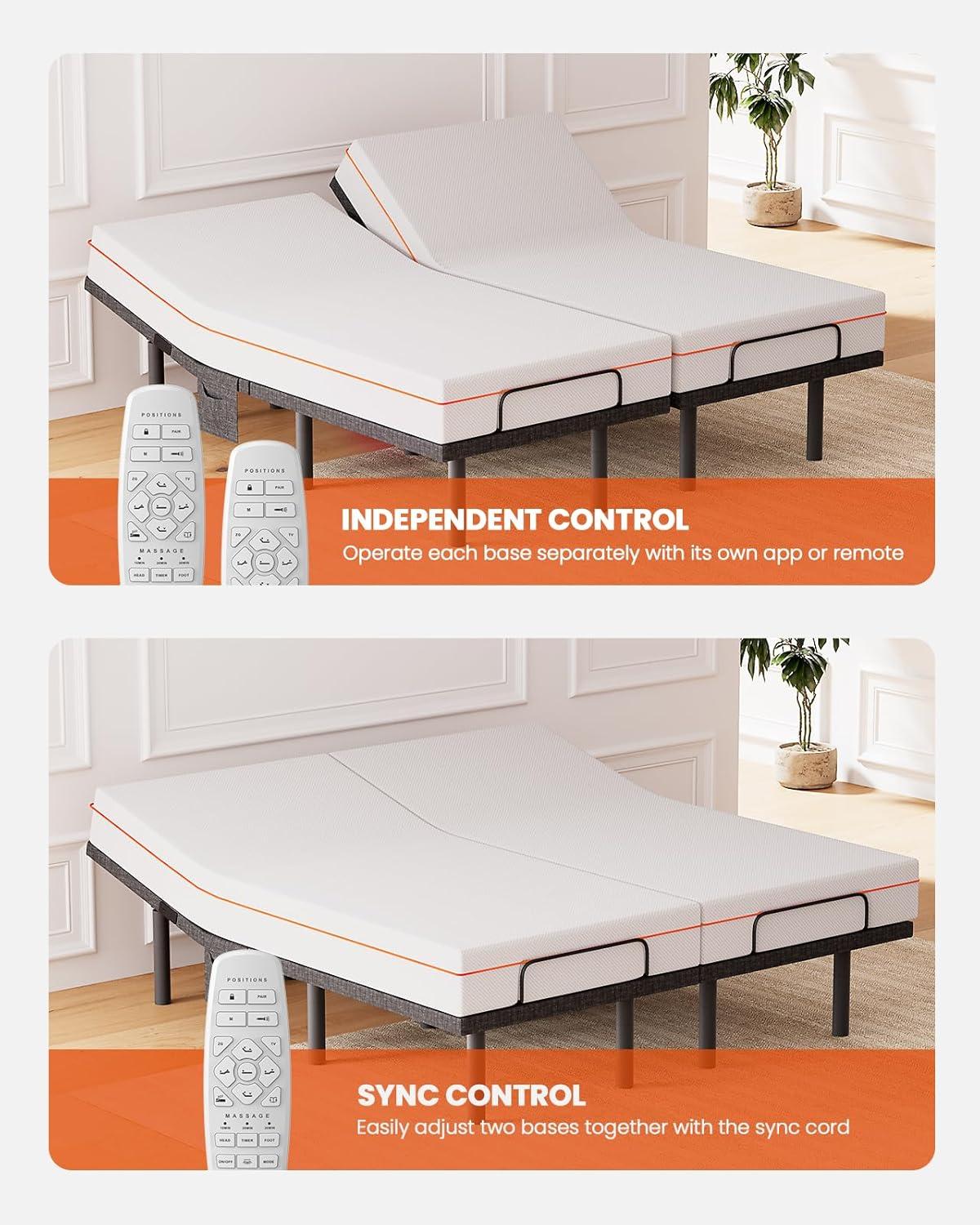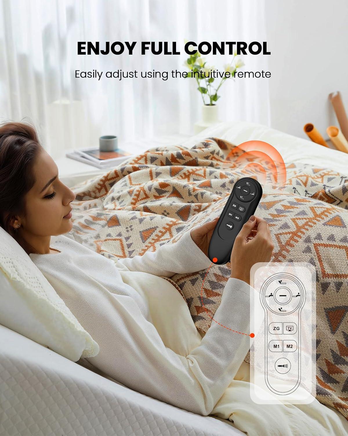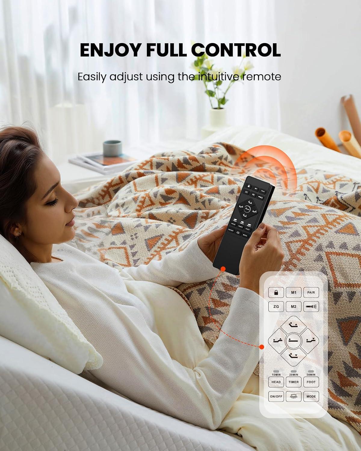 Durable Steel Frame: Built with high-strength steel, this adjustable bed can support up to 750 lbs, ensuring a secure foundation for your rest. Tested to withstand 15,000 lift cycles—1.5 times the industry standard—this bed is designed for long-lasting performance. Enjoy peace of mind knowing your bed frame is built to deliver consistent comfort and durability, no matter how often you adjust positions.