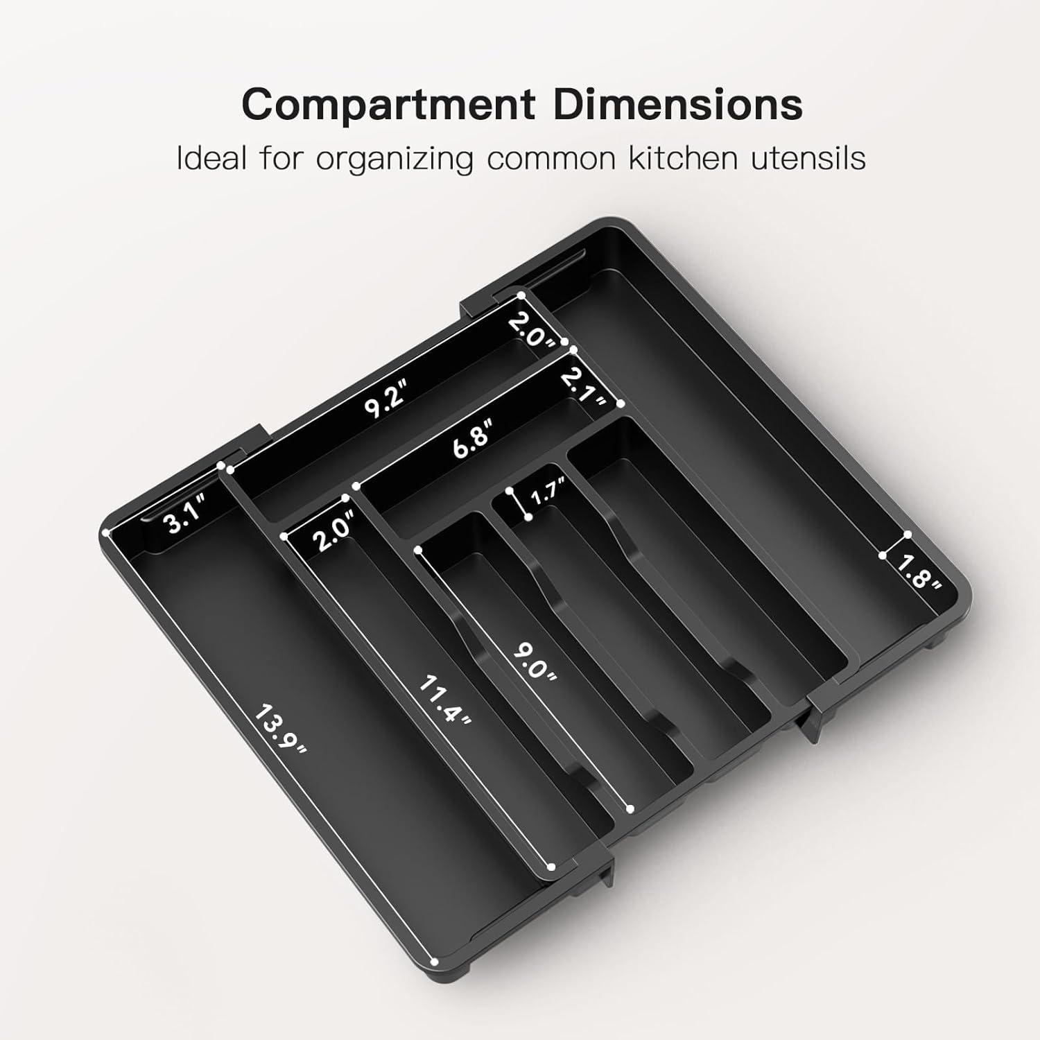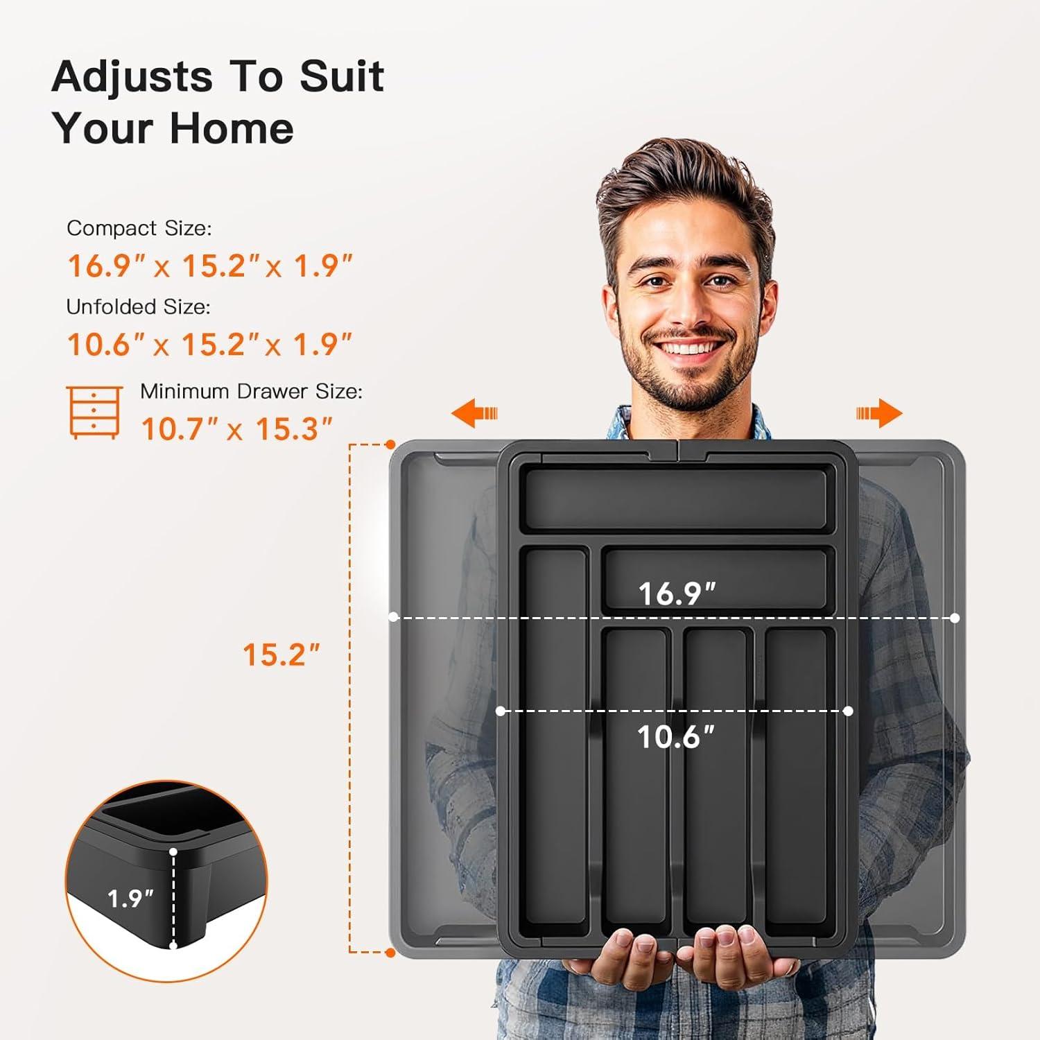 Adjusts To Suit Your Space: Featuring a clever expandable design, this drawer organizer fits a variety of drawer sizes and shapes. It measures 10.6″ in width when folded, expanding up to 16.9″ when fully extended, with a length of 15.1″ and a height of 1.9″ – a utensil drawer organizer versatile enough for almost all your storage needs.