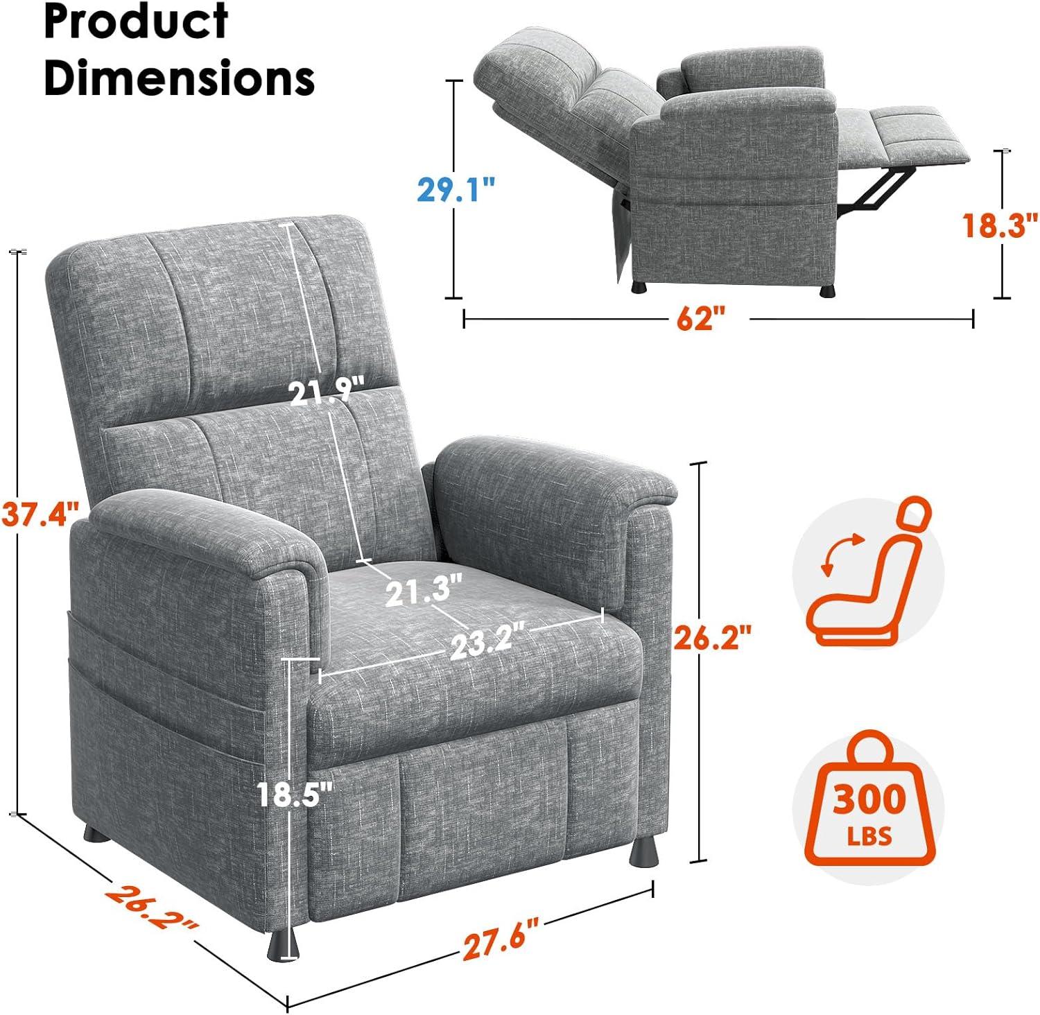 【Durable & Stable・Multi-Scene Adaptability】: Tested through tens of thousands of tilt cycles for durability, recliner chairs for adults features a sturdy steel frame construction with a maximum weight capacity of 300 lbs. Its structural design significantly enhances durability and safety, making it a reliable choice for long-term home use. Classic color schemes and sleek, minimalist lines adapt seamlessly to various home settings like bedrooms, studies, and living rooms. It can also serve as an RV recliner for outdoor travel