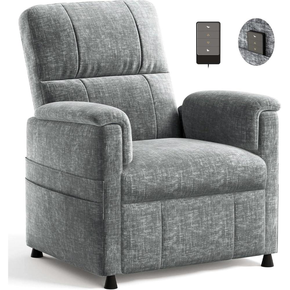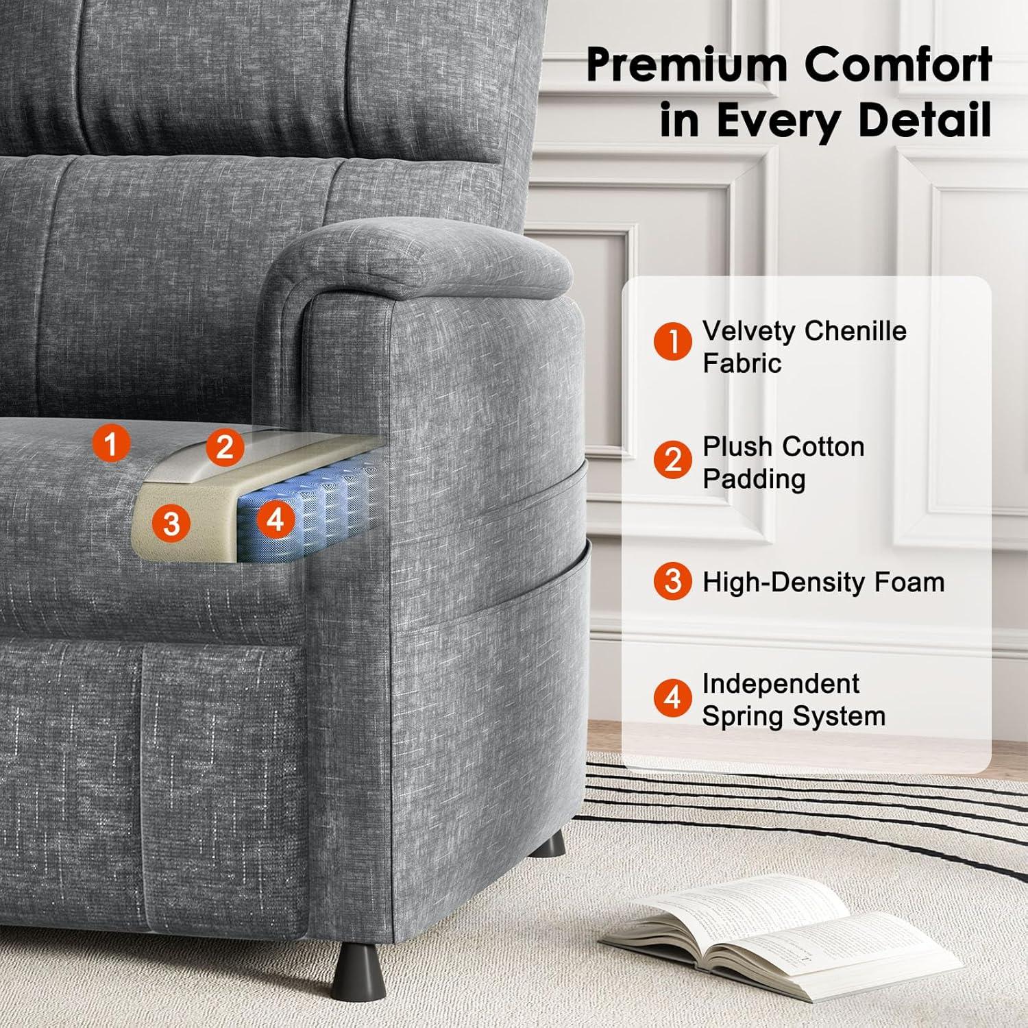 【Compact Space Solution・Skin-Friendly Comfort】:A Electric Reclining Chair designed for smaller areas, featuring a seat width of 23.2 inches (55 cm), elevated armrests at 26.2 inches (66 cm), and a maximum recline length of 62 inches (165 cm). The segmented backrest features ergonomic design with high-resilience foam padding and an independent pocket spring system, providing precise support for every part of your body. The chenille fabric surface offers a velvety-soft, skin-friendly feel that's breathable and sweat-wicking, making it perfect for year-round use