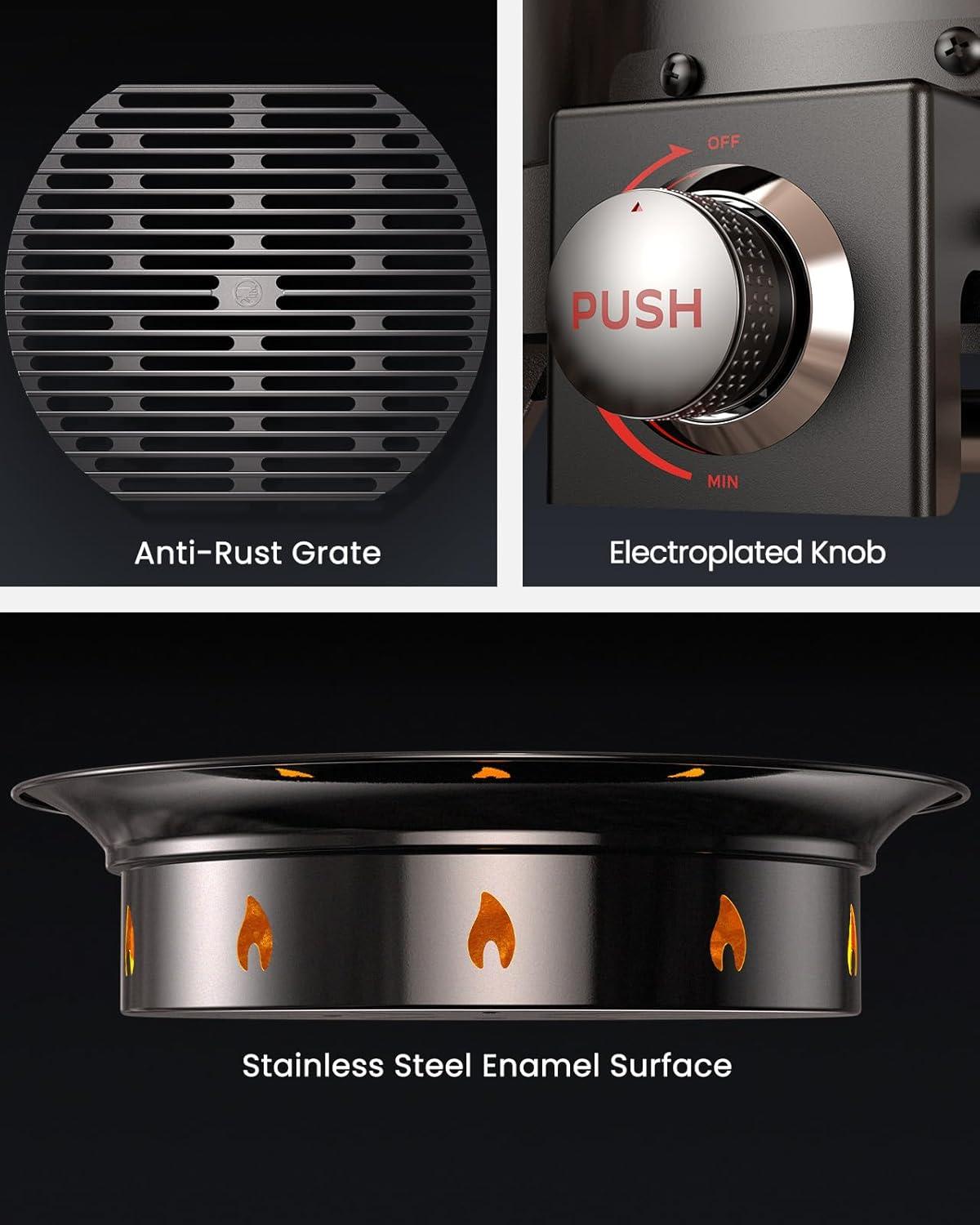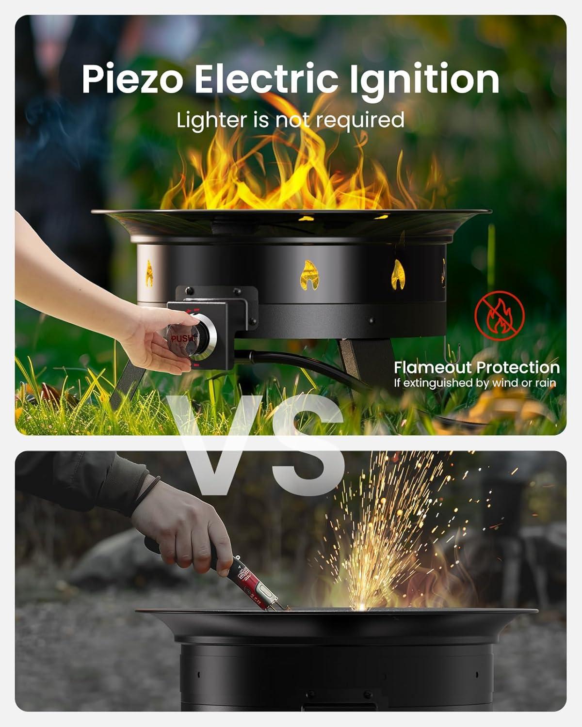 Piezo Electric Ignition for Easy Use: The portable outdoor fire pit features piezo ignition, which is secure and reliable without the need for batteries or external power. Simply push and hold the electroplated knob for 3 seconds, then turn to MAX and hold for 5 seconds. It is designed to light reliably every time.