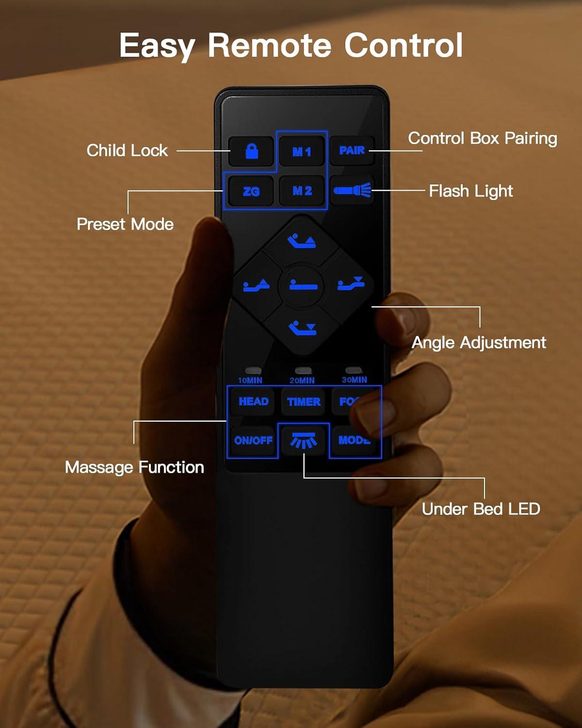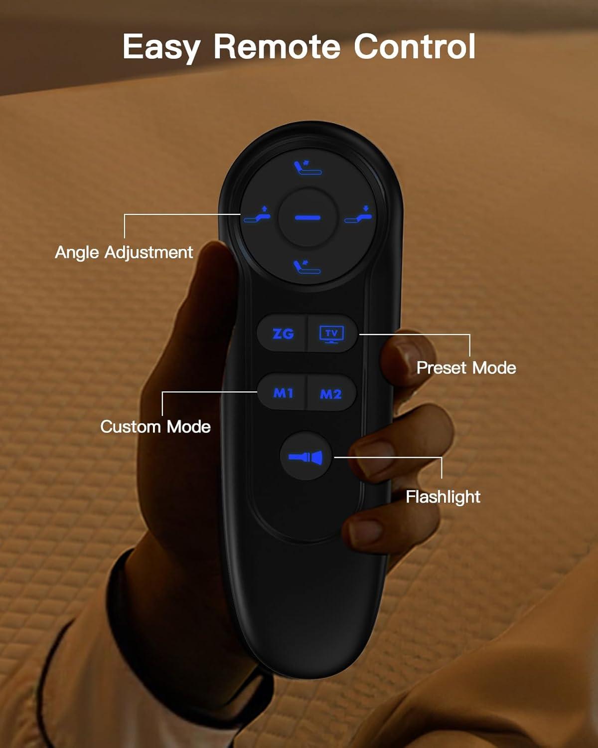 Convenient Remote Control: The adjustable bed frame comes with a backlit remote control, with buttons that glow blue at night. The back of the remote also features a flashlight, making it easy to operate in dim lighting. The remote is user-friendly and intuitive, particularly suited for seniors or people with limited mobility, allowing them to adjust the electric bed functions quickly and easily.