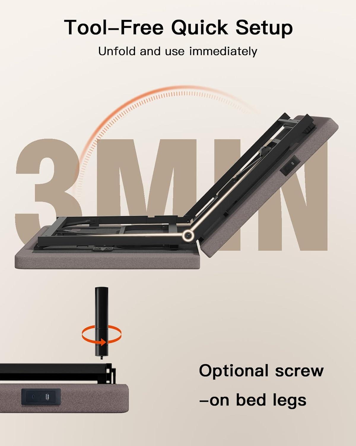Easy Installation & Zero-Clearance: This electric bed offers two usage modes: zero-clearance mode and regular mode. You can choose not to install the bed legs, simply apply non-slip tape to the back, and place the adjustable bed frame directly on the platform bed. Alternatively, install the included bed legs for regular use, making it compatible with all types of bed frames. Installation is simple—just unfold and use, or easily screw in the legs.