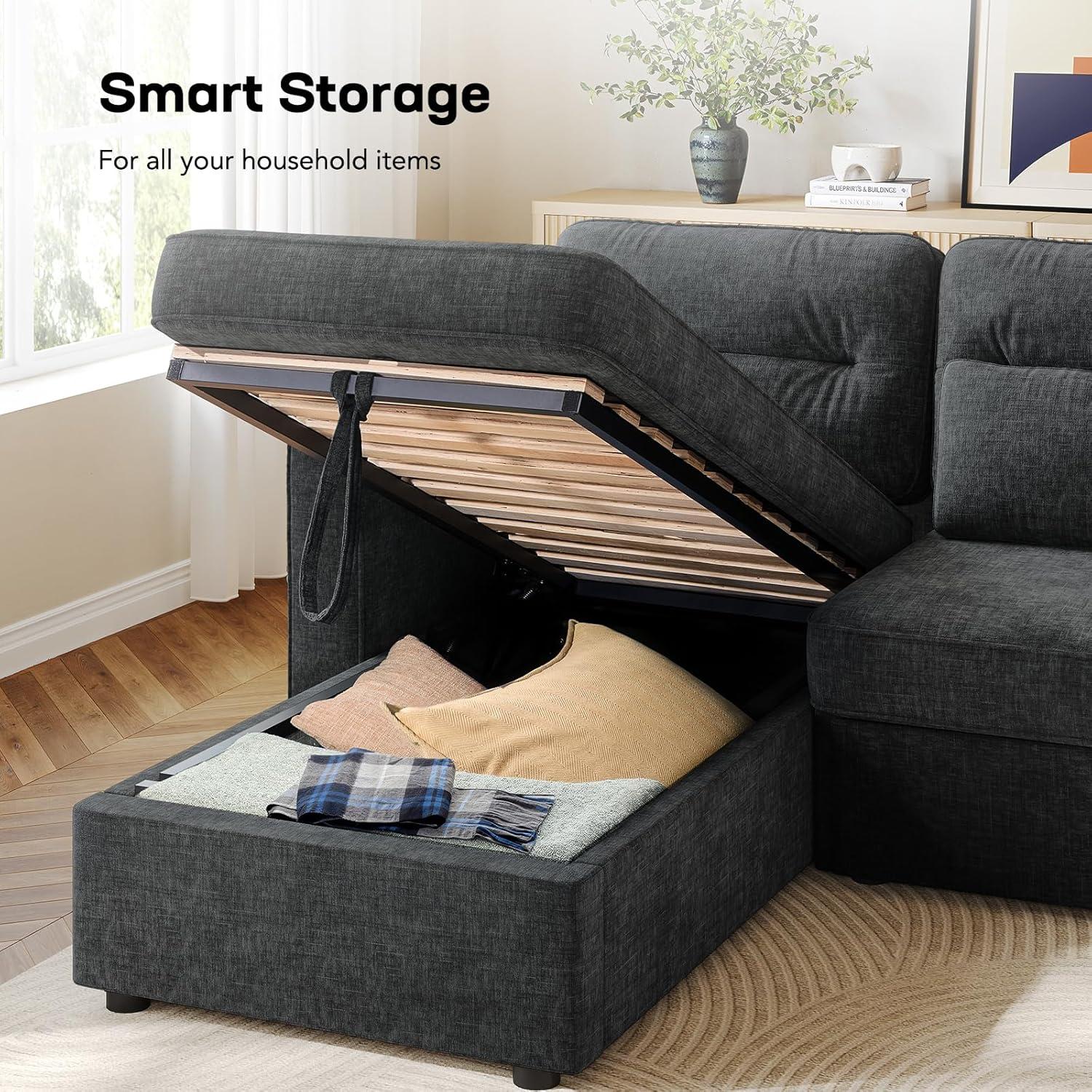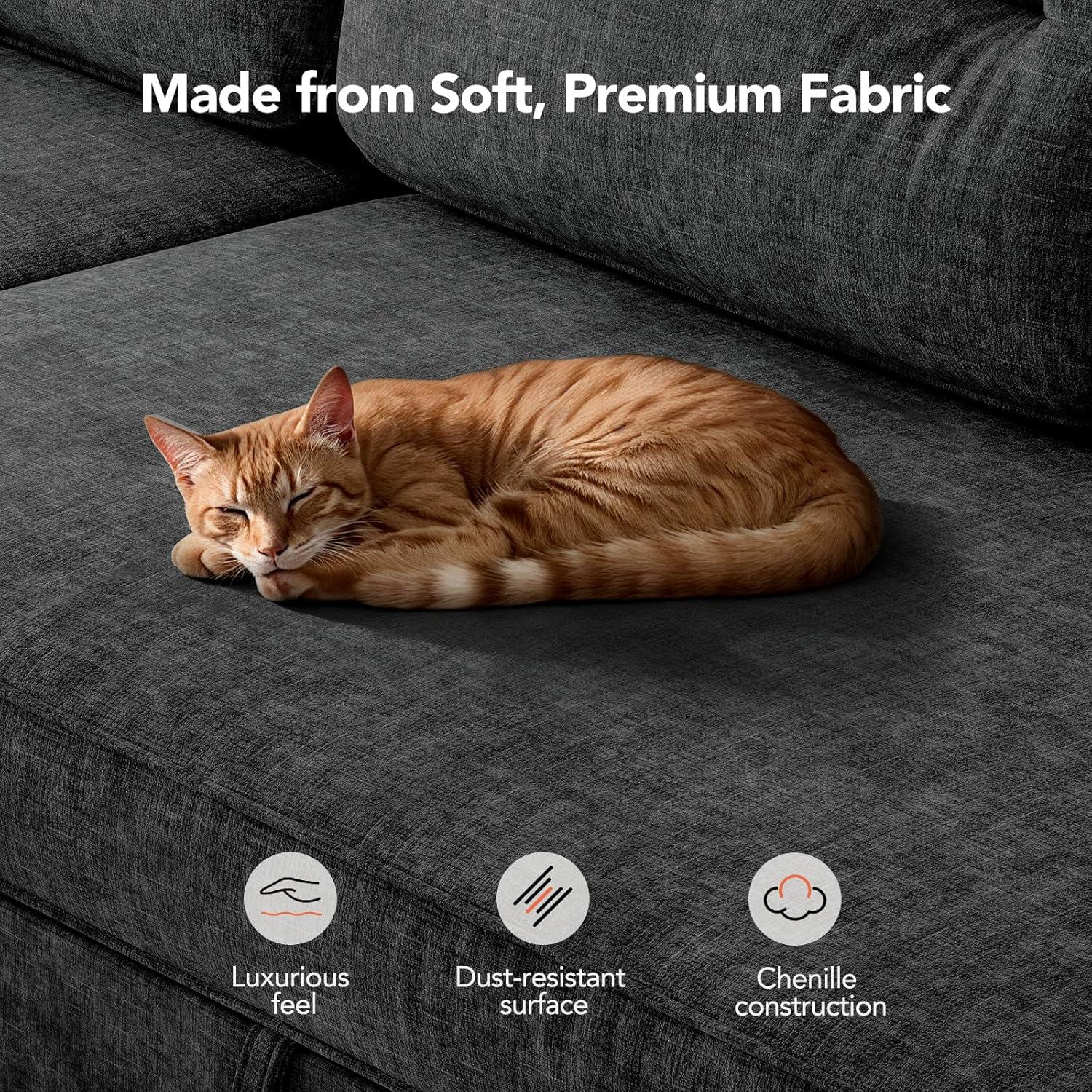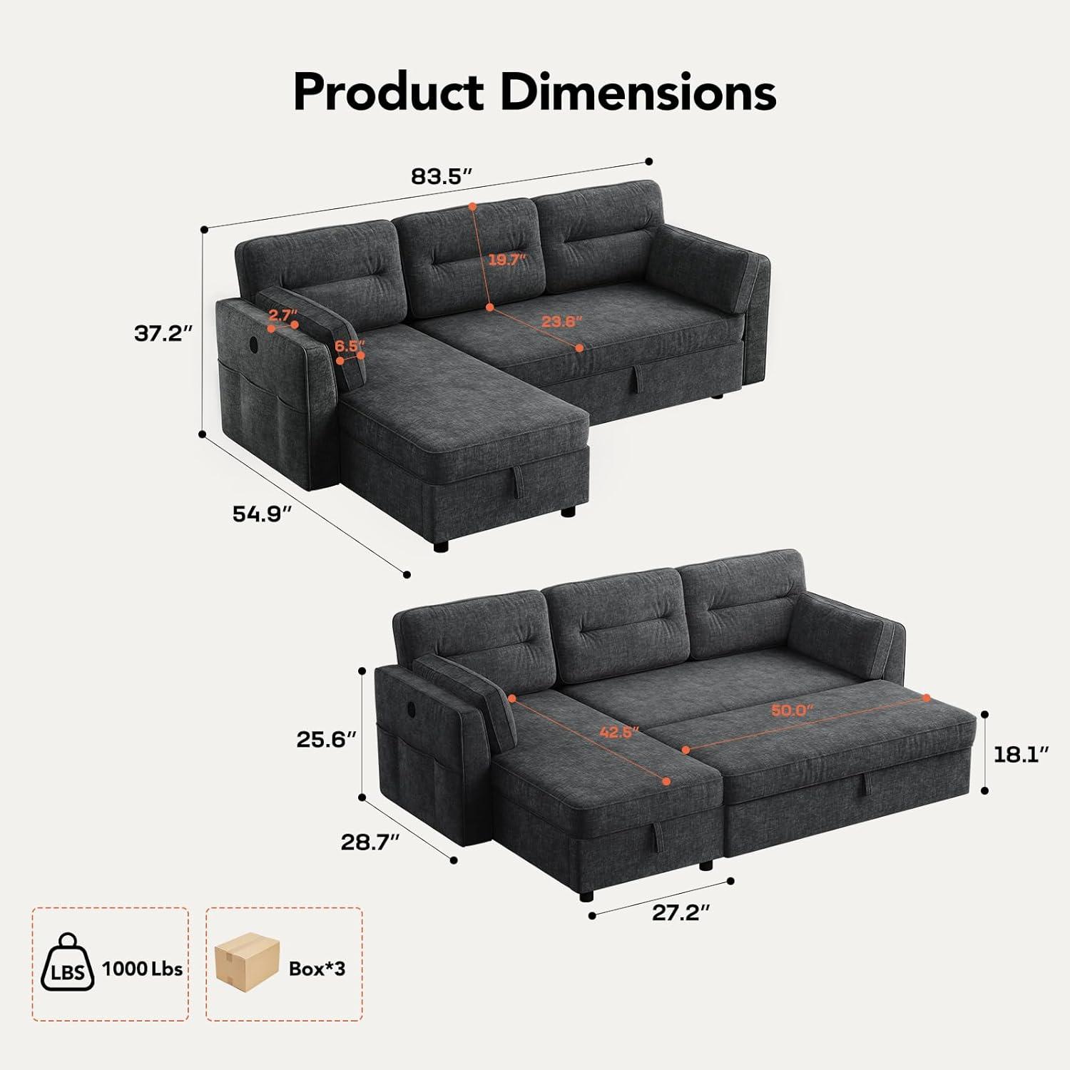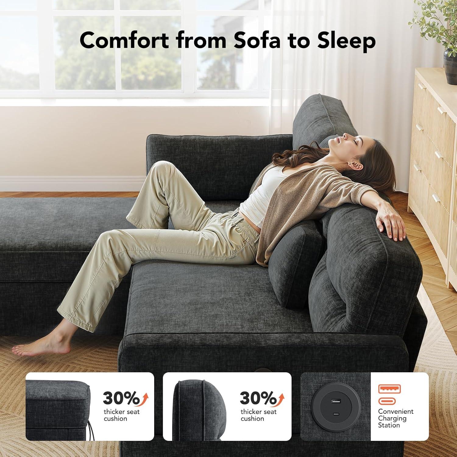 Amada Sectional Sofa Bed with Reversible Storage Chaise, Pull Out Couch Bed Convertible Cloud Chenille Couch with USB Charging & Side Pockets, L Shaped Modular Couches for Living Room Apartment(Dark Gray)
